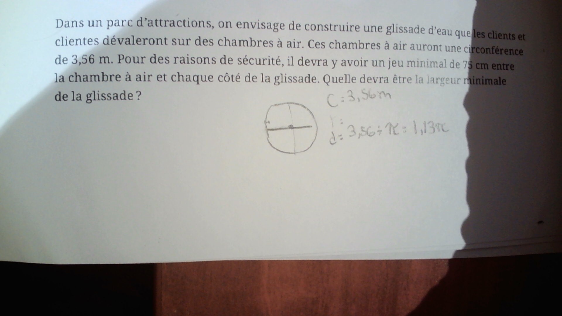 Secondaire 2 • 9mje comprend toujours pas la question 4 ( sur quoi je vais rajouter le 75 cm la circonférence ou au diamètre?)