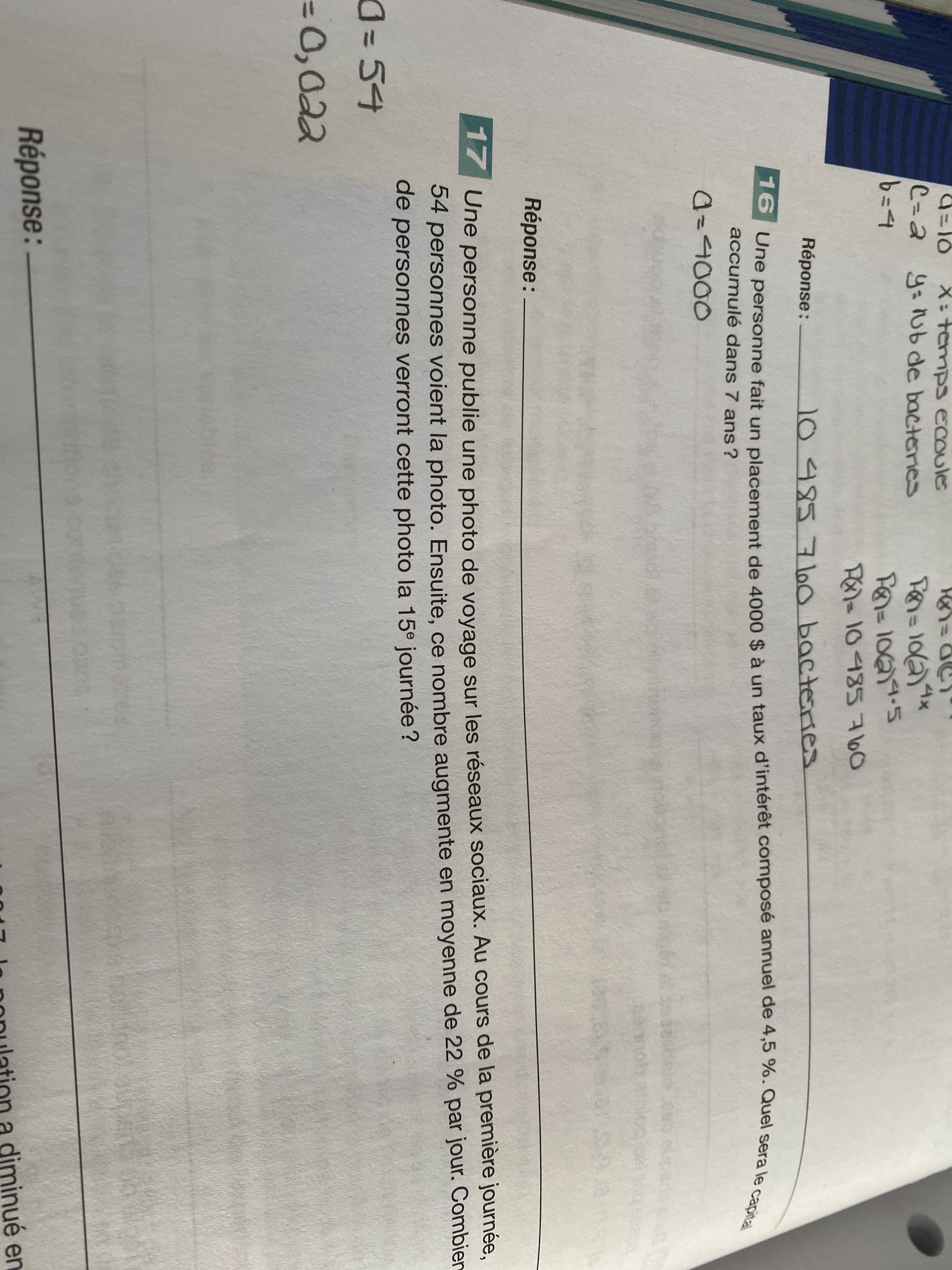 Secondaire 5 • 10mBonjour, je suis entrain de faire un devoir en math et je me demandais quel serait mon B dans les numéros 16-17?? Pour trouver la règle. C’est une fonction exponentielle. Merci!!☺️