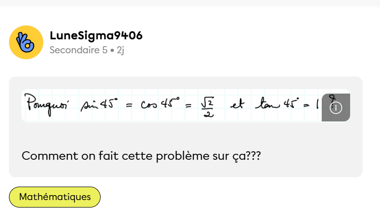 Secondaire 5 • 26jBonjour je suis en sec5 CST, et j'ai oubliée les côtés "respectifs" d'un triangle (SOH-CAH-TOA) par exemple sin= opposé sur hypoténuse, j'ai oubliée où ils sont placés dans le triangle et pareille pour cos= adjacent sur hypoténuse ainsi que tan= opposé sur adjacent :)