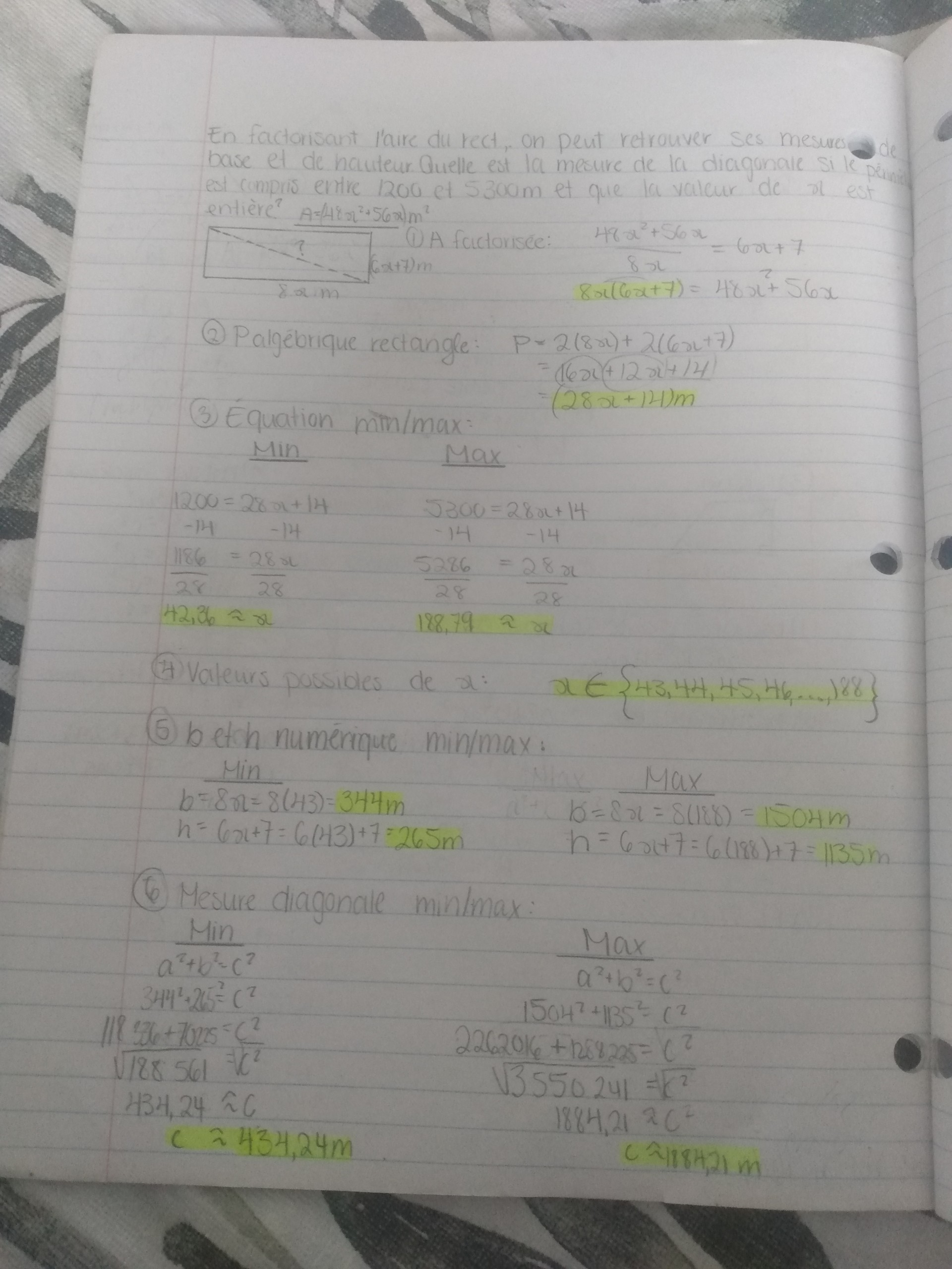 Secondaire 3 • 26jSalut!Voici mon exercice. J'ai besoin de votre aide pour savoir s'il faut que les mesures possibles des diagonales soient donné en une intervalle. Est-ce que ma réponse finale doit être que les valeurs de la diagonale sont de 434,24 m à 1184,21 m? Ou seulement 434,24 m et 1184,21 m sont mes seules valeurs possibles, sinon la contrainte de la valeur de x entière n'est pas respectée.