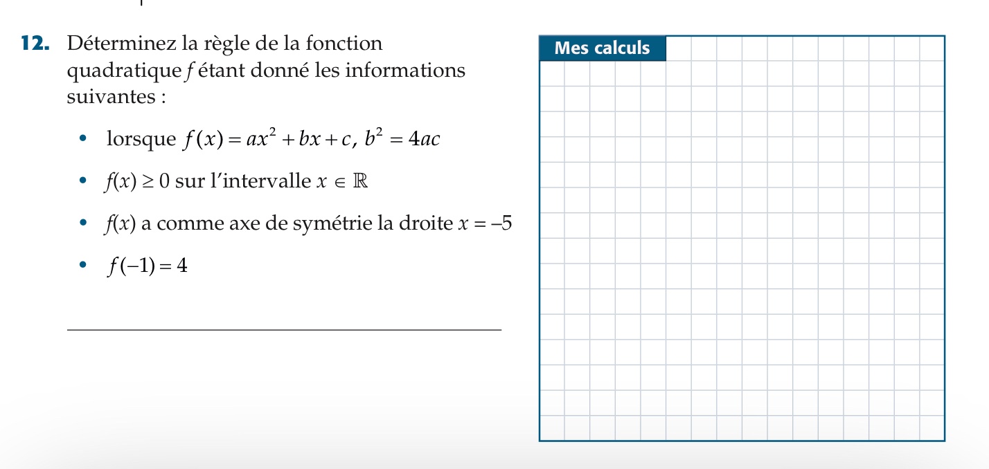 Secondaire 4 • 1aRe-bonjour! Le problème ici est que je dois trouver l’inéquation, et non l’équation. J’ai réussi à trouver la formule et le a de la formule, mais je ne sais pas comment le mettre en inéquation.
