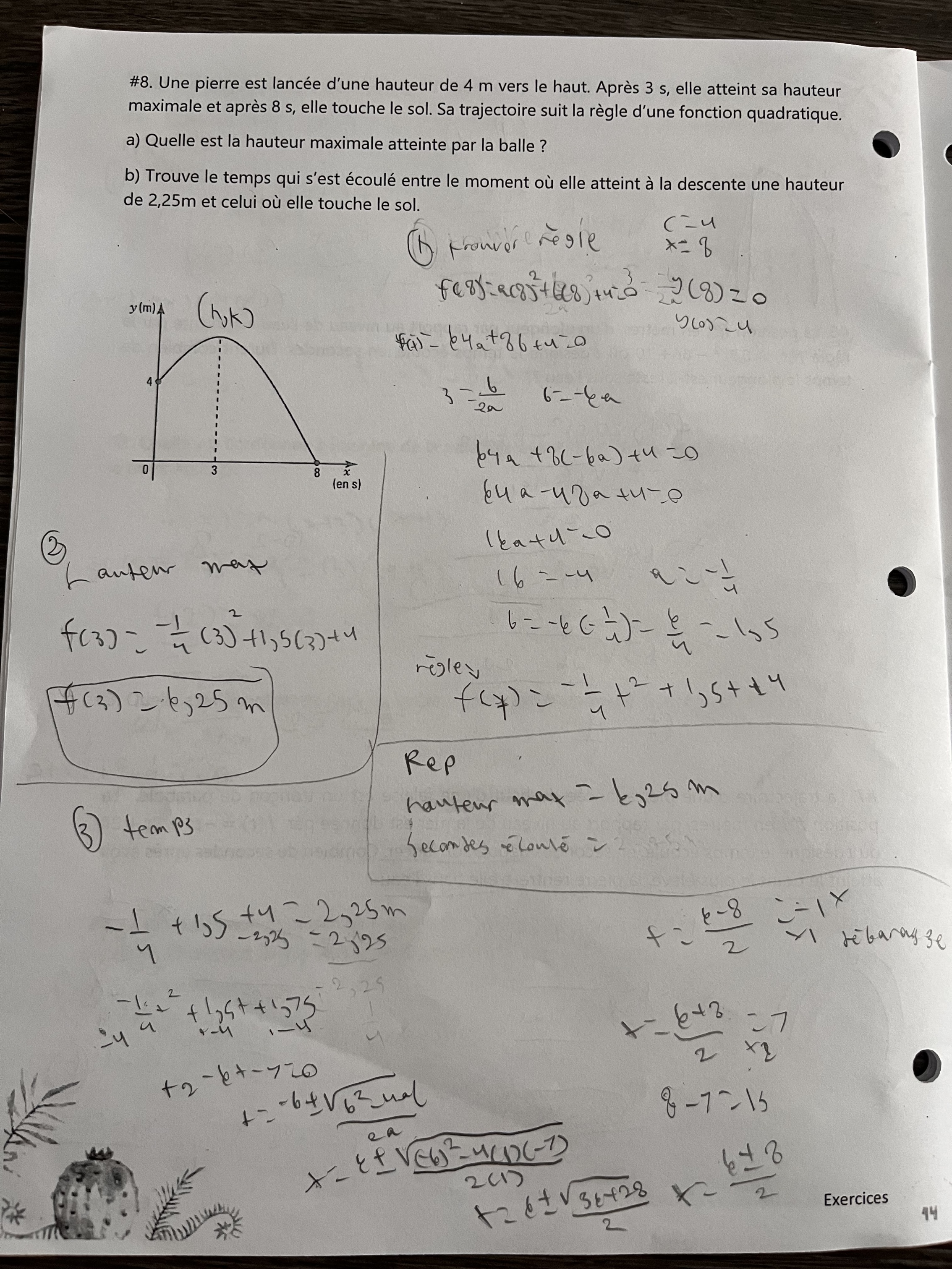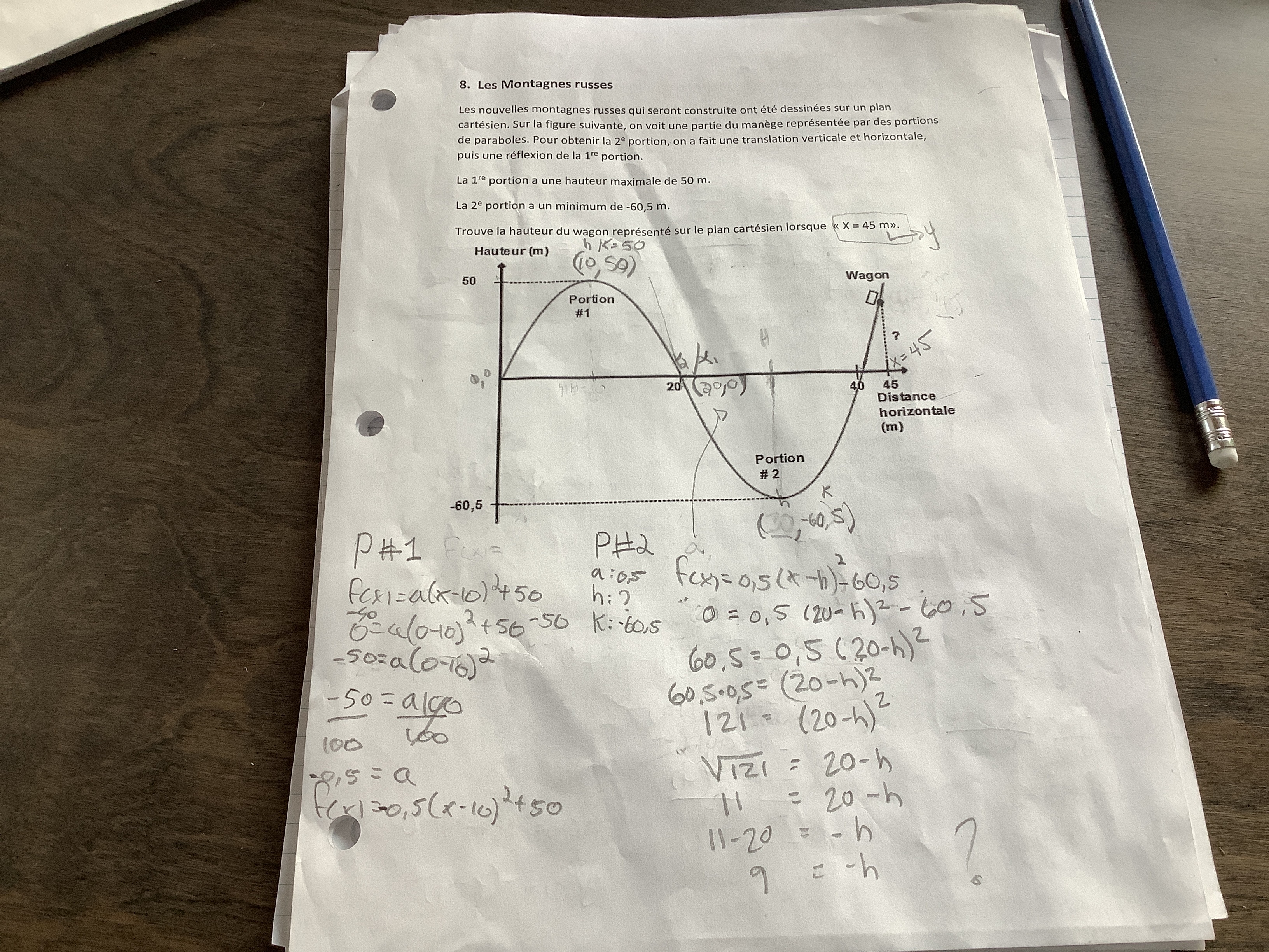 Secondaire 4 • 1aMalheureusement, je ne comprends pas votre explication. Est-ce que mon équation de départ pour la portion 2 est la bonne avec un a positif à O,5. Si oui, je n’arrive pas au résultat d’un h=31. Qu’elle est mon erreur? Merci