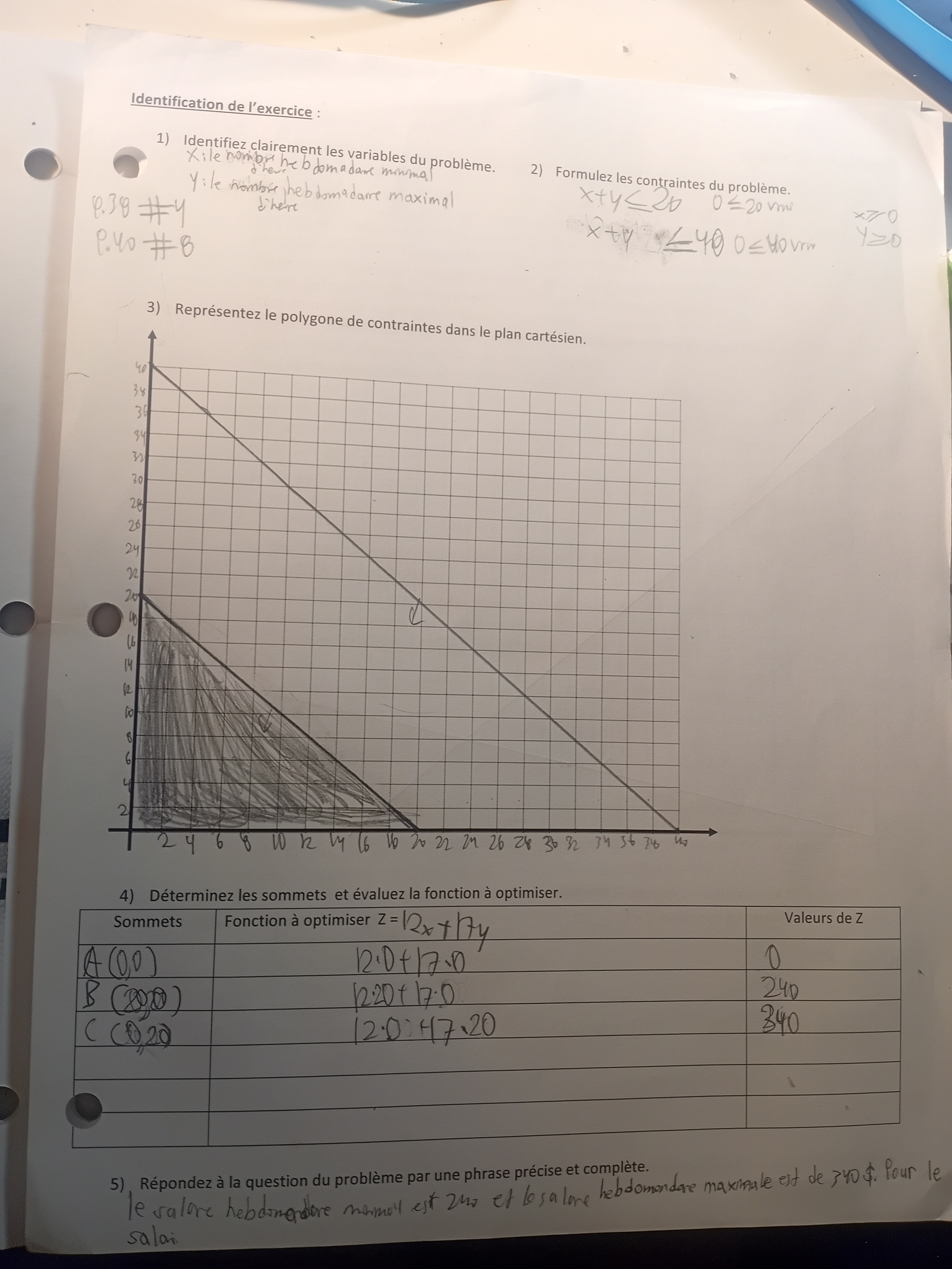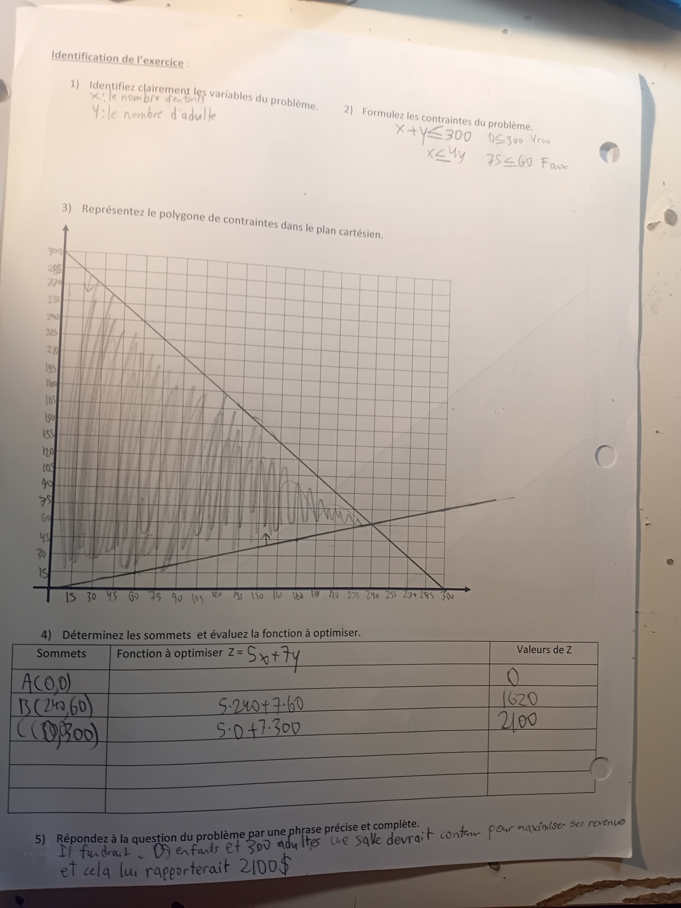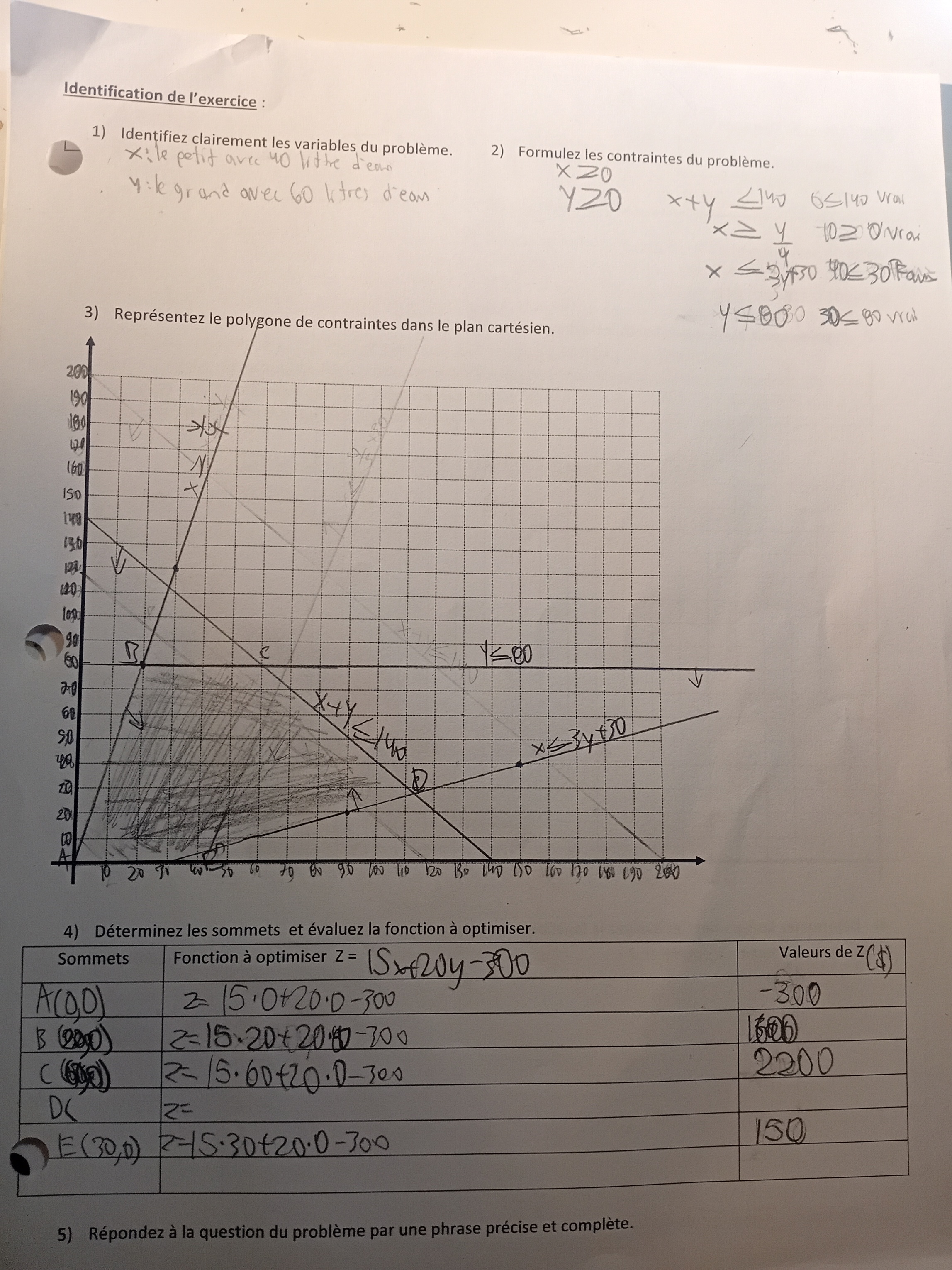Je suis en train de faire un problème de math. Ça m'a donné pour le point D x=112,5 et y=27,5. Donc, mon prof a fait quatre possibilités. Dans ses calculs, je vois qu'il a seulement mis l'inequation <_ donc je me demande pourquoi mon prof de math a seulement mis l'inequation <_ dans ses calculs de correction de quatre possibilités et comment on l'a su. Merci alloprof