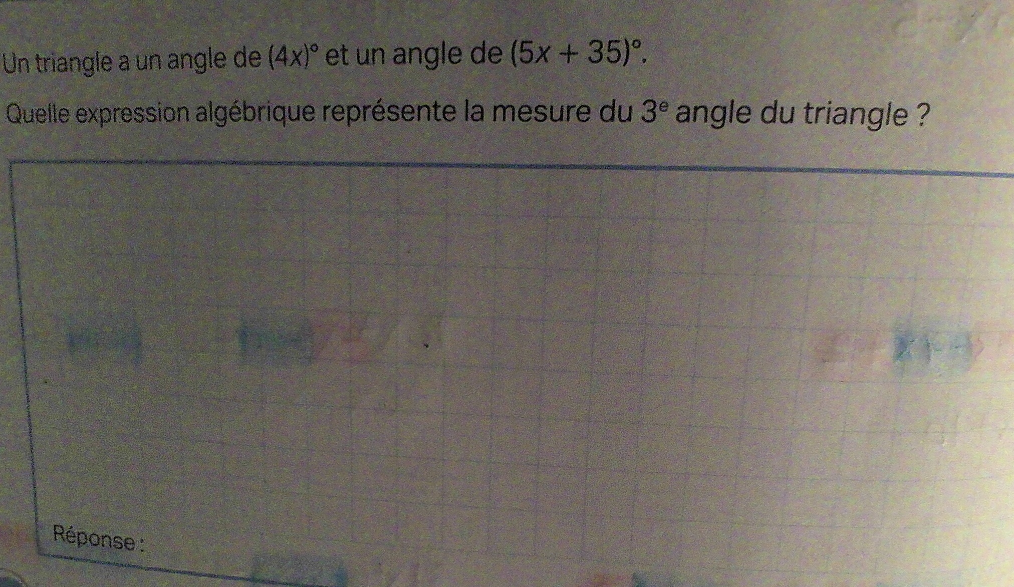 Secondaire 3 • 1mBonjour, je suis en math de secondaire 3 et je ne comprend pas ce numéro.Comment fait-on pour trouver l'expression algébrique qui représente la mesure du 3e angle du triangle?