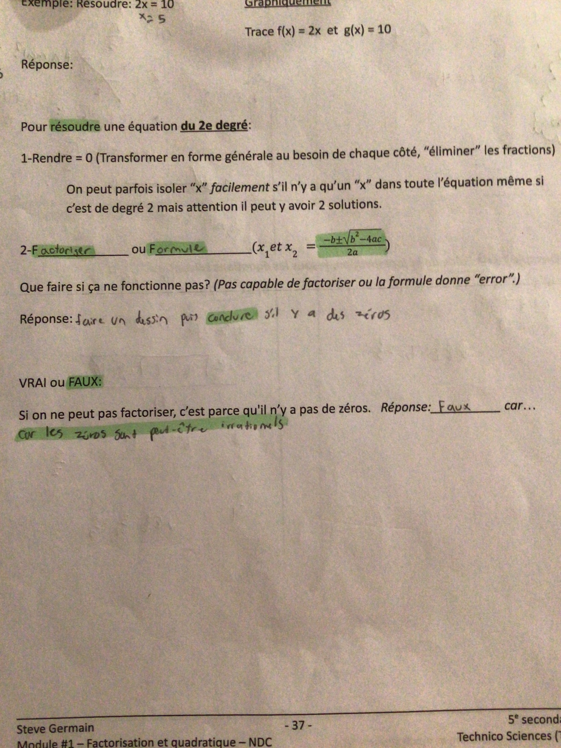 Secondaire 5 • 1asalut, voici le corrigé d’un problème de math que je n’arrive pas à comprendre. J’ai essayé de tout rendre égal à zéro les formule f1 et f2, et ensuite j’ai voulu utiliser la formule ( b+/- racine carré -b^2-4ac / 2a)pour trouver les zéros. Ça n’a pas fonctionner. Je me demande alors pourquoi. Aussi, dans le corrigé, je devrais transformer la formule en généralemais pourquoi ?