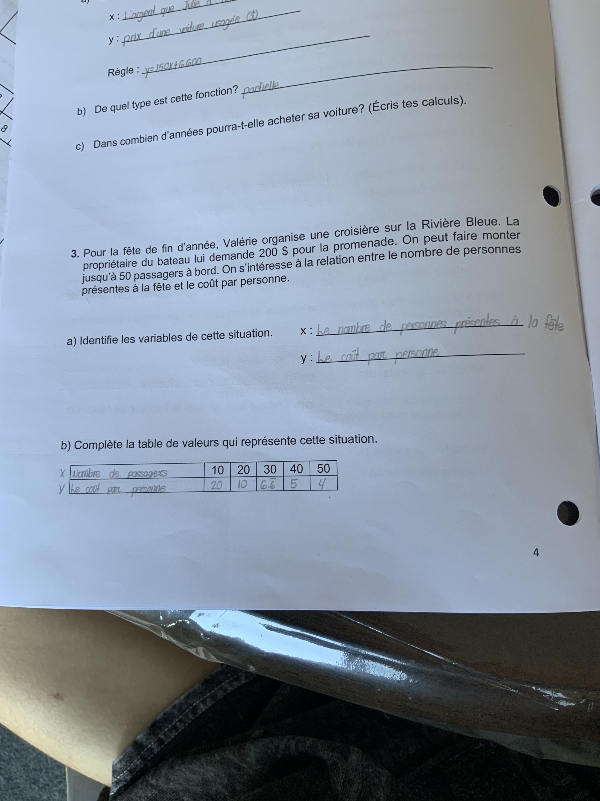pour le voyage organiser par l'école il y a un maximum de 50 place. Chaque personne doit payer son billet qui coute 50$ et que l'autobus coute 600$, quelle sera la fonction rationnelle obtenue.