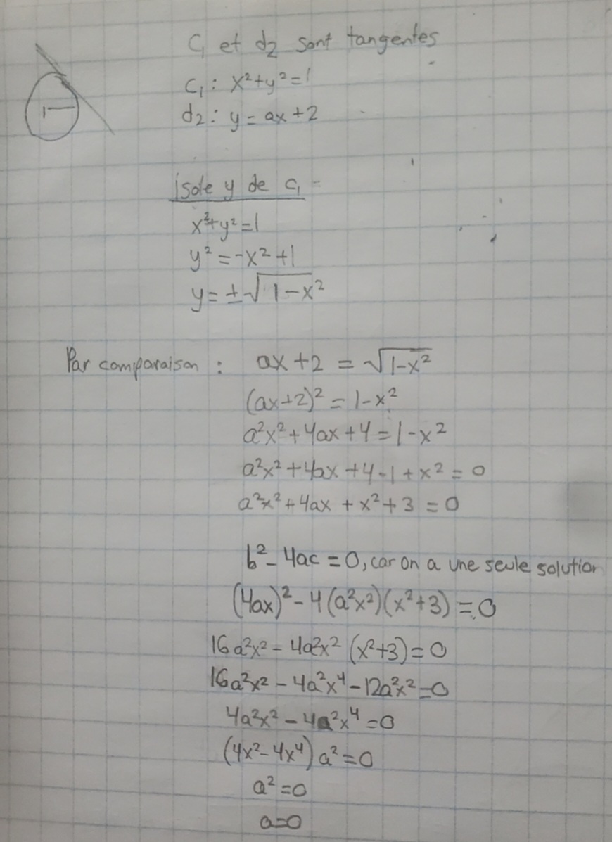 Secondaire 5 • 1aBonjour j'ai un problème très difficile en math sn de 5J'ai fais ça:Mais je sais pas pourquoi ca me donne a est équivaut à 0, ma prof m'a dit que la réponse est que a= -1.7 mais je sais pas comment le trouver ?