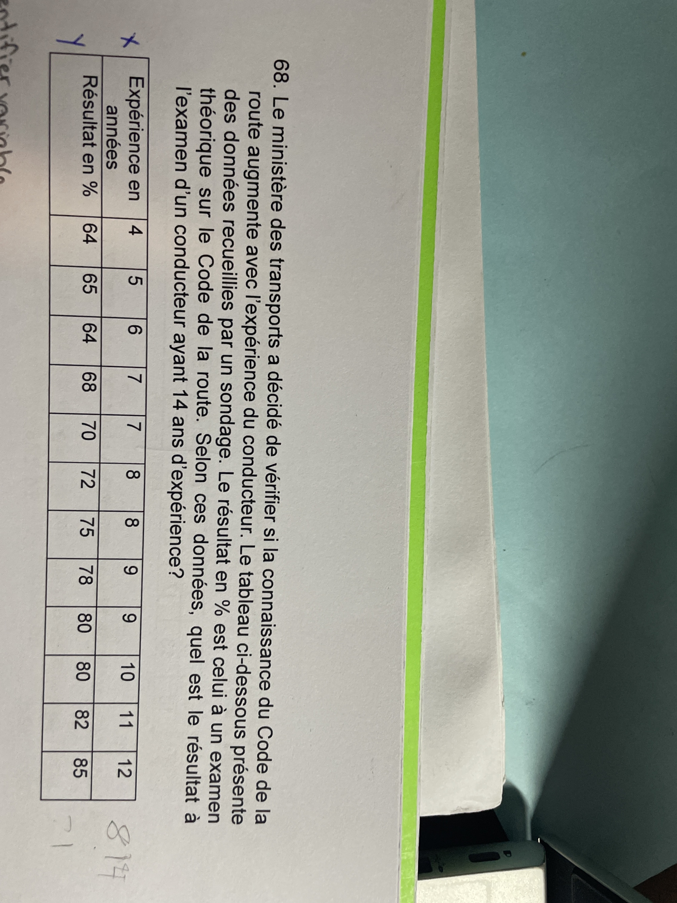 Secondaire 5 • 1aBonjour, j'ai ici un problème mathématique. J'ai un tableau de donné démontrant le résultat des élèves de 4 à 12 ans en pourcentage. Je dois trouver le résultat de 14 ans comment je m'y prend ?