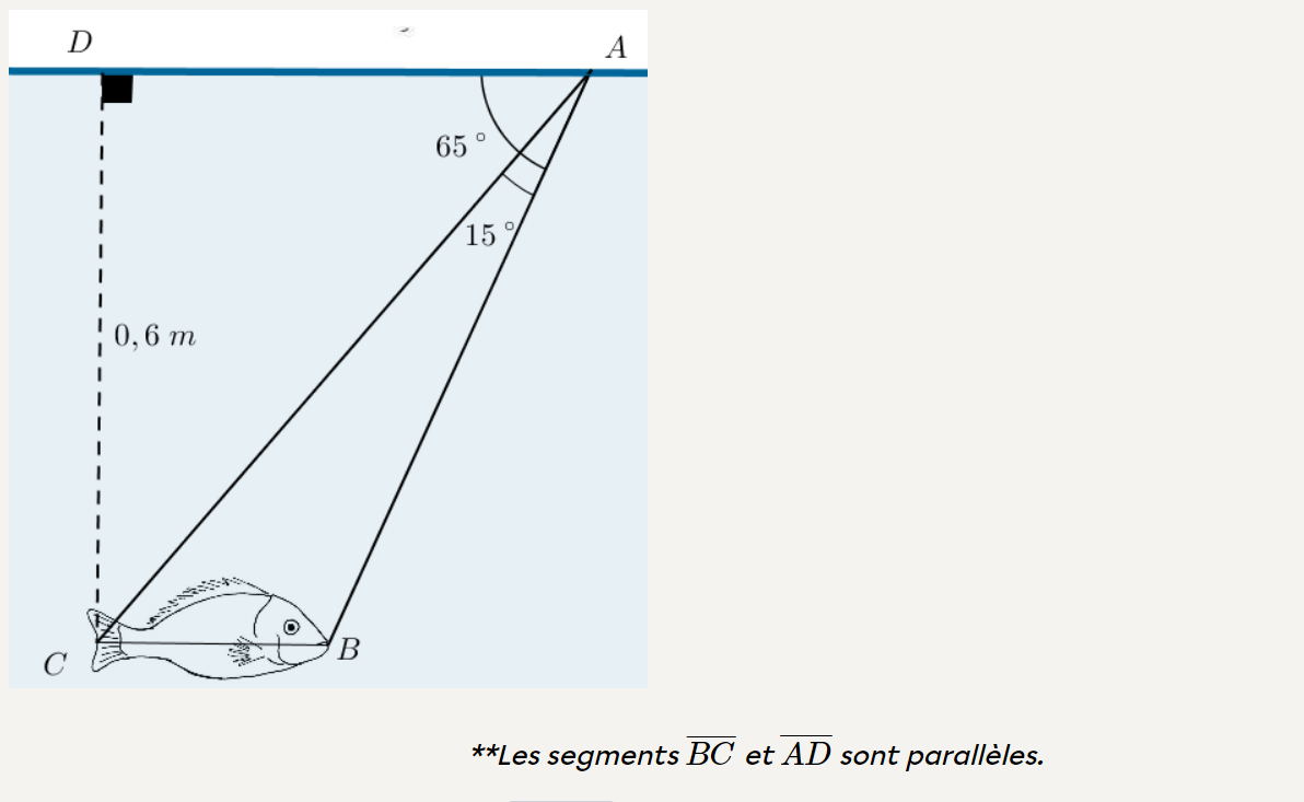 En réalisant la pratique ministérielle en mathématique, je suis arrivé à un mauvais résultats (ici on cherche la mesure du poisson ) pour <ACB car j'ai utilisé l'information :Les segments 𝐵𝐶¯ et 𝐴𝐷¯ sont parallèles. pour ensuite le segment CA comme sécante et arriver à la conclusion que < ACB était de 65 degré et dons < ABC de 100 degré par somme des angles intérieurs d'un triangle( ce qui est faux aussi selon le corrigé ) et après avec les rapports trigonométrique j'ai trouvé que le segment AC ( dans le triangle rectangle ACD) était de 0,6620 m ce qui est faut selon le corrigé encore . Bref, j'aimerais comprendre quelles déductions j'ai fait qui étaient fausses et pourquoi je n'ai pas le droit de les faire . Merci