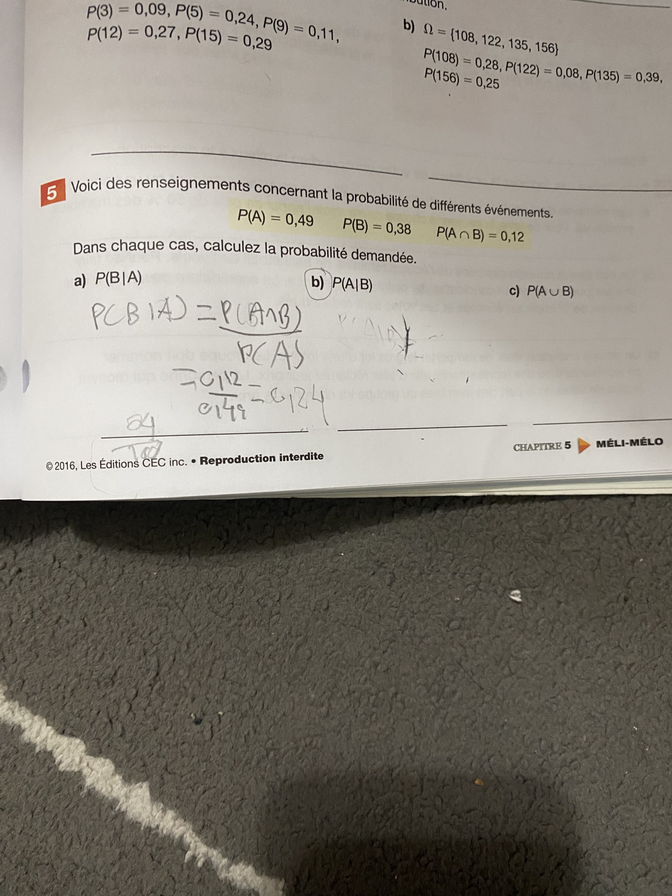 Secondaire 5 • 1aBonjour, j’ai besoin d’aide pour le b et c ici. Je ne sais pas quel formule employer pour le b) et pour le a) je ne sais pas comment trouver P(A U B)