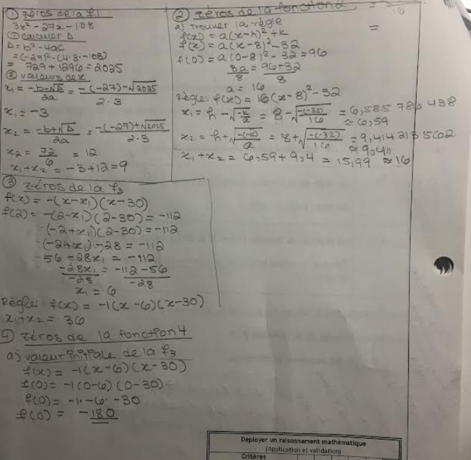 Je suis bloquée dans la partie de la fonction 4 (il y a deux variables soit a et x2) et donc je ne sais pas comment les trouver... Aussi, pour la relation, j'ai trouvé que x1+x2=-b/a (par contre je ne sais pas comment employer les infos à ma disposition pour arriver jusqu'au bout).Voici ma démarche:Merci!
