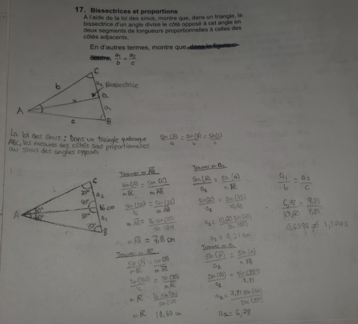 Secondaire 4 • 1aJe sais pas pourquoi c'est pas égale comme mon c est 7.81 (mesure de AB) et mon b est 10.60