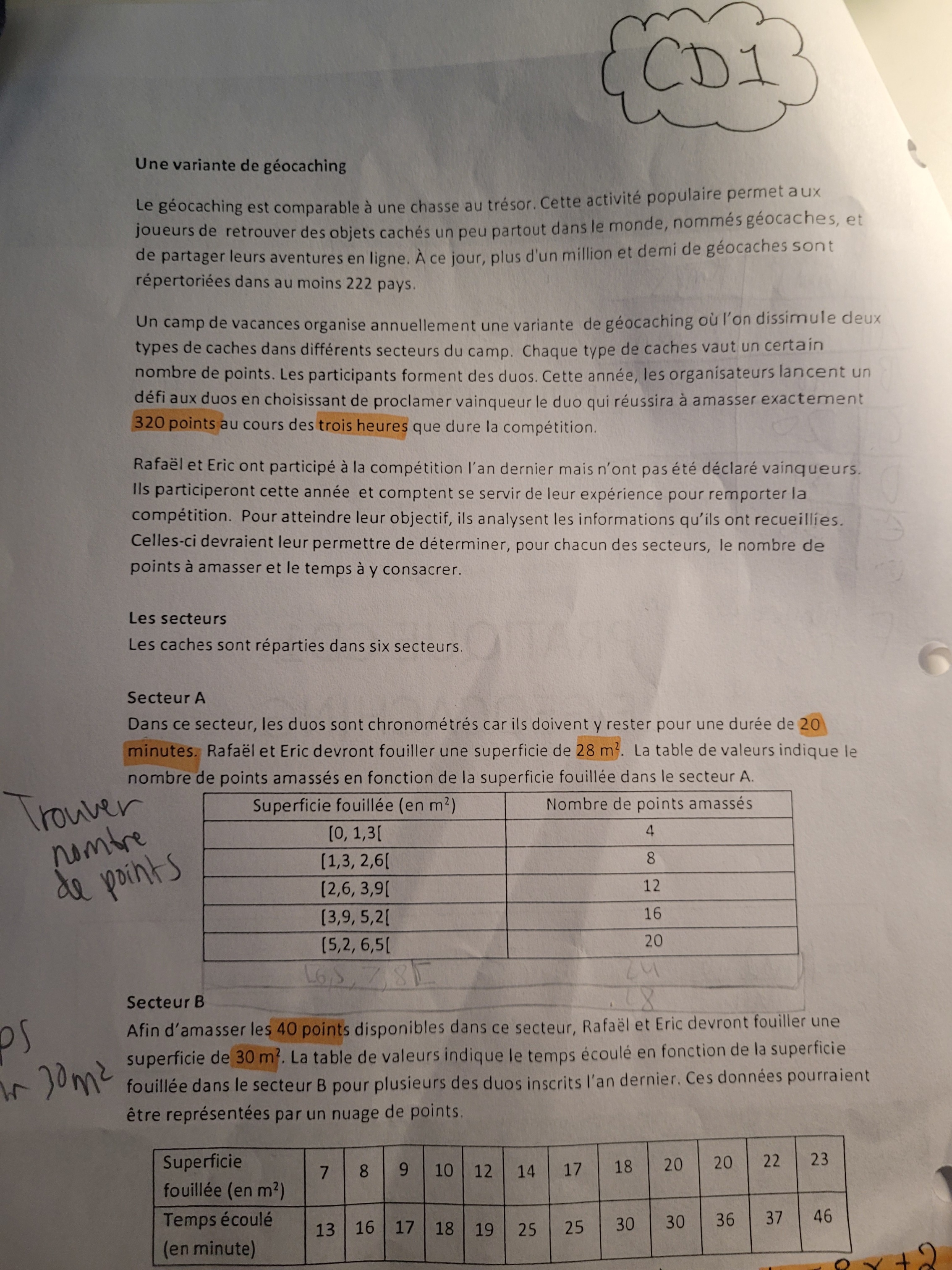 Secondaire 4 • 1aBonjour je voulais savoir comment résoudre la partir du secteur A de ce problème, ou il faut trouver le nombre de points en fonction de la superficie fouillé, je ne sais pas comment procéder à cause des intervalles
