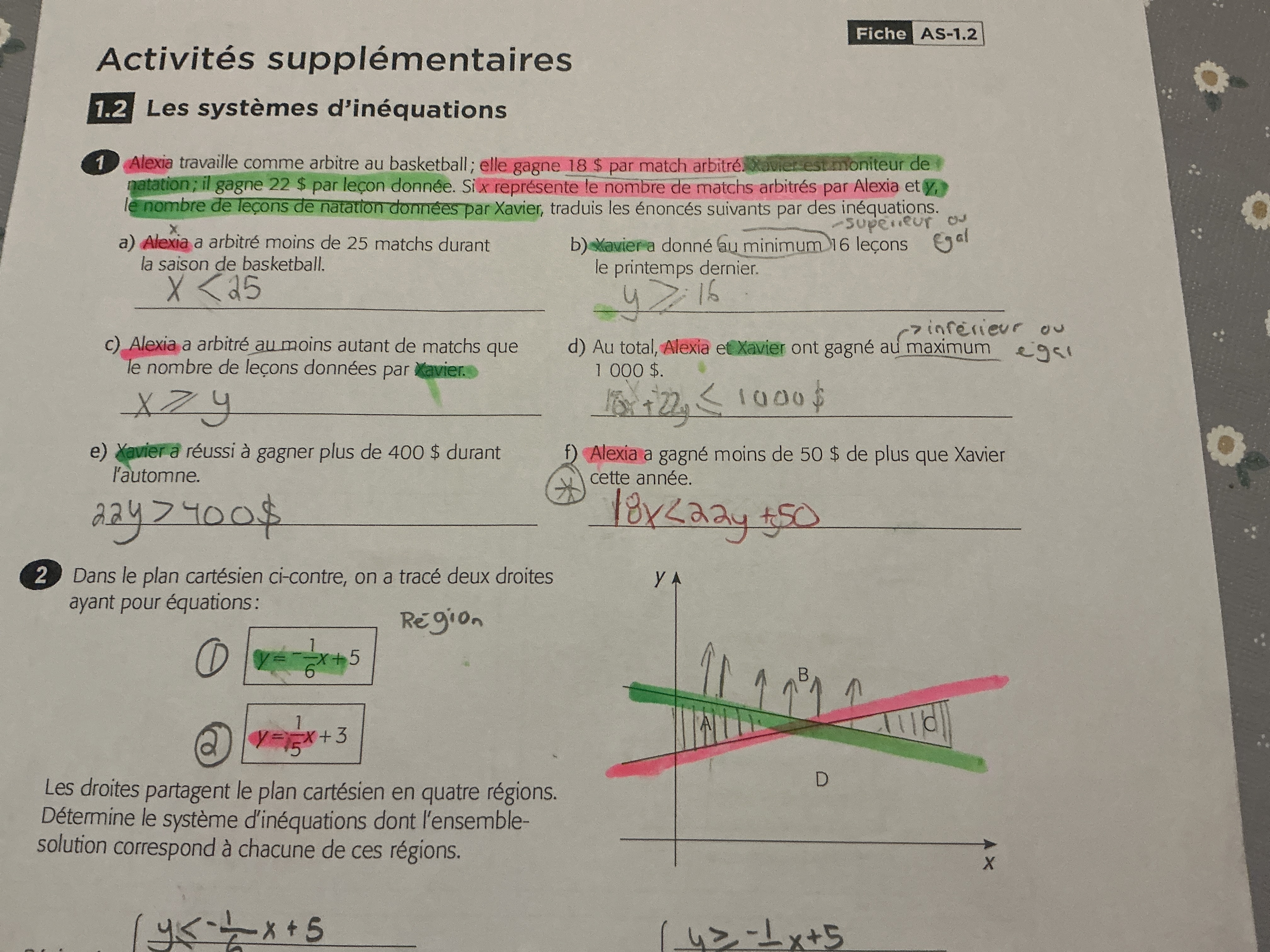 Secondaire 5 • 2mBonjour Alloprof ! J’ai besoin d’aide dans la lettre f du numéro 1. En effet, il y a beaucoup d’informations dans le même énoncé et lorsque vient le temps de transcrire l’inéquation j’ai de la difficulté. Pourriez-vous m’expliquer étape par étape pourquoi c’est cette réponse svp. Merci d’avance