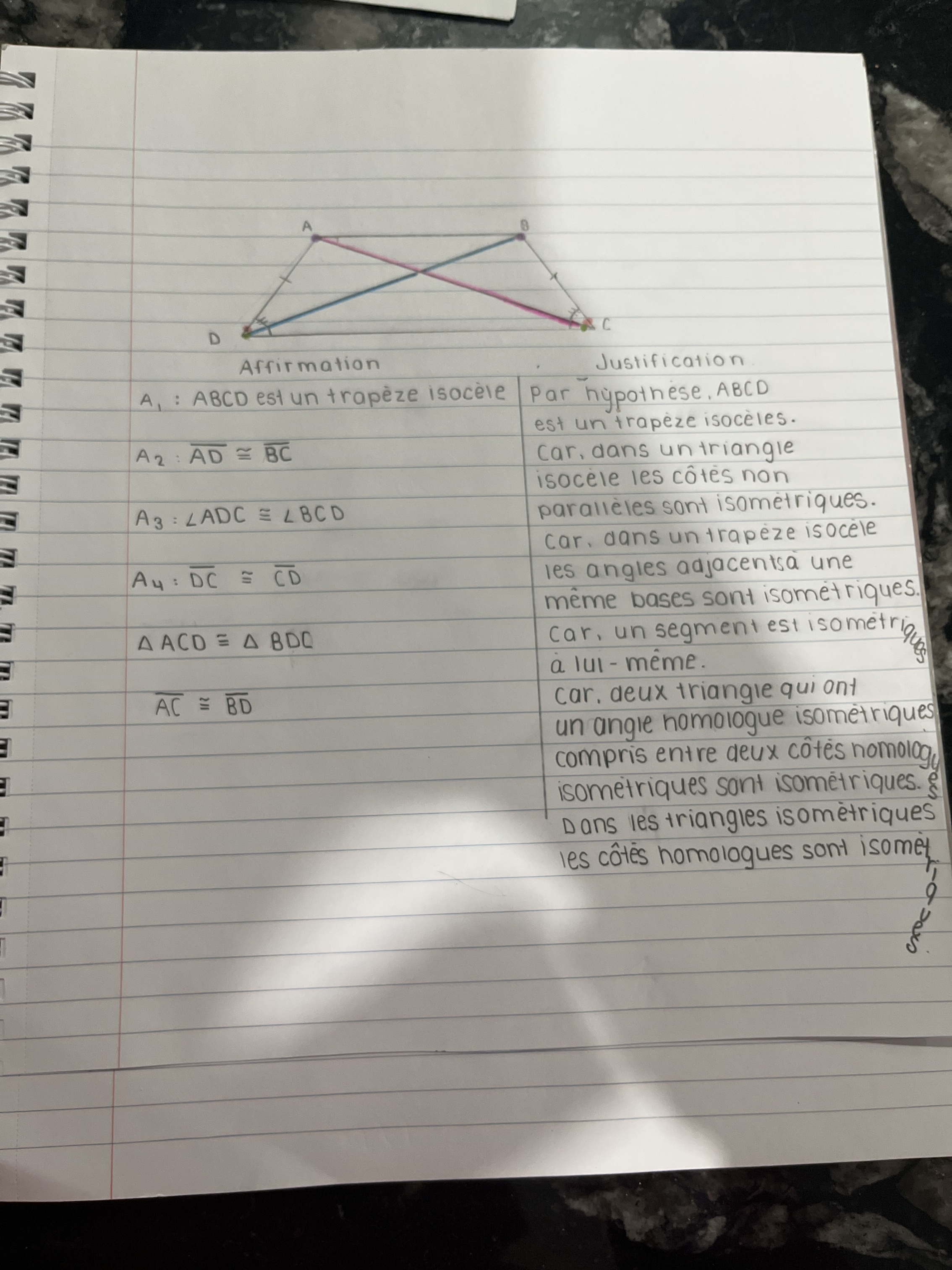 Secondaire 4 • 1aEst ce que c’est la bonne démarche pour démonter que les diagonales du trapèze isocèle sont les coté de deux triangles je ne suis pas sur si la dernière affirmation démontre réellement que les diagonales d’un trapèze isocèle sont les côtes des triangles sinon que dois je faire ? (Math SN)