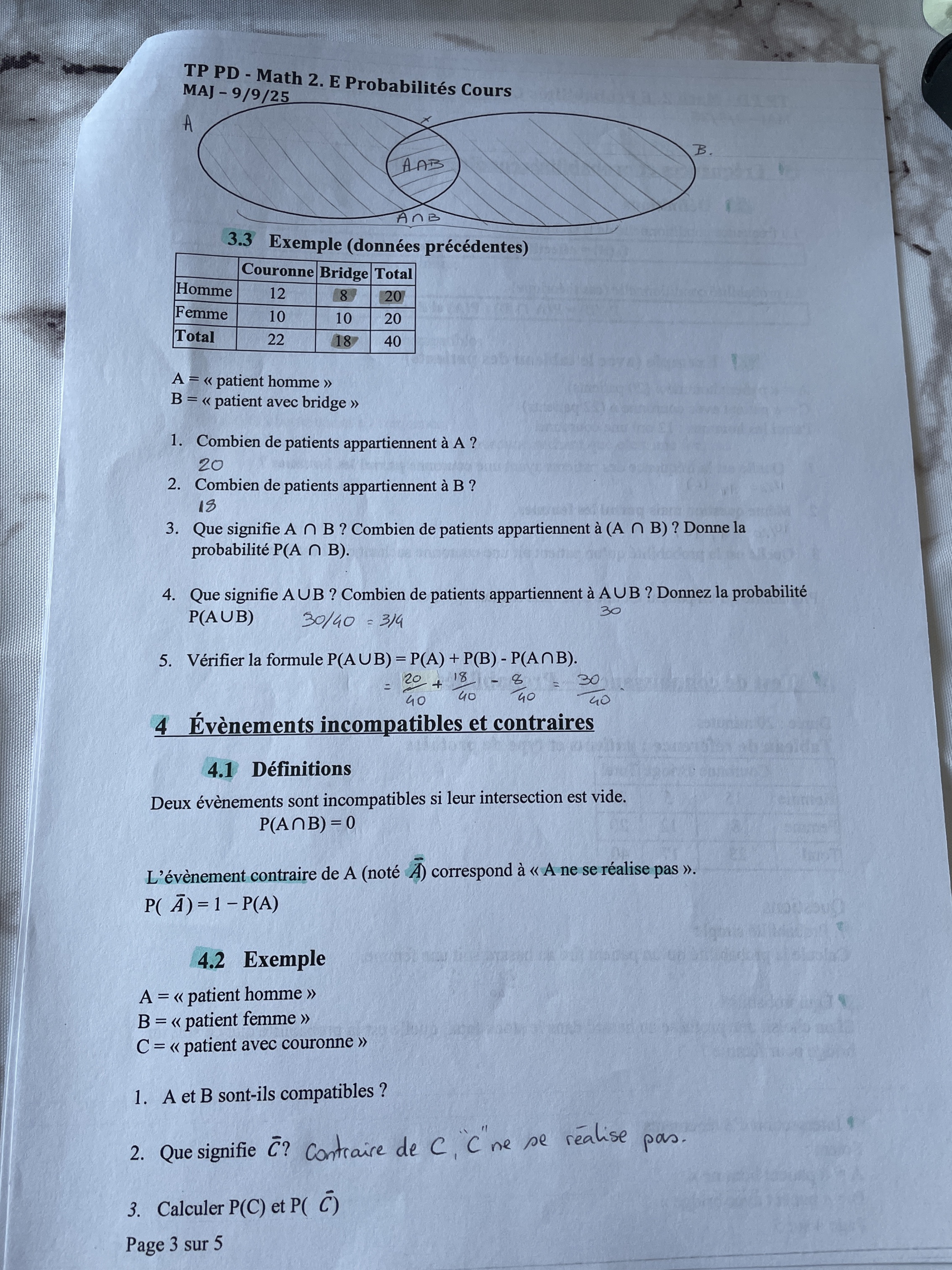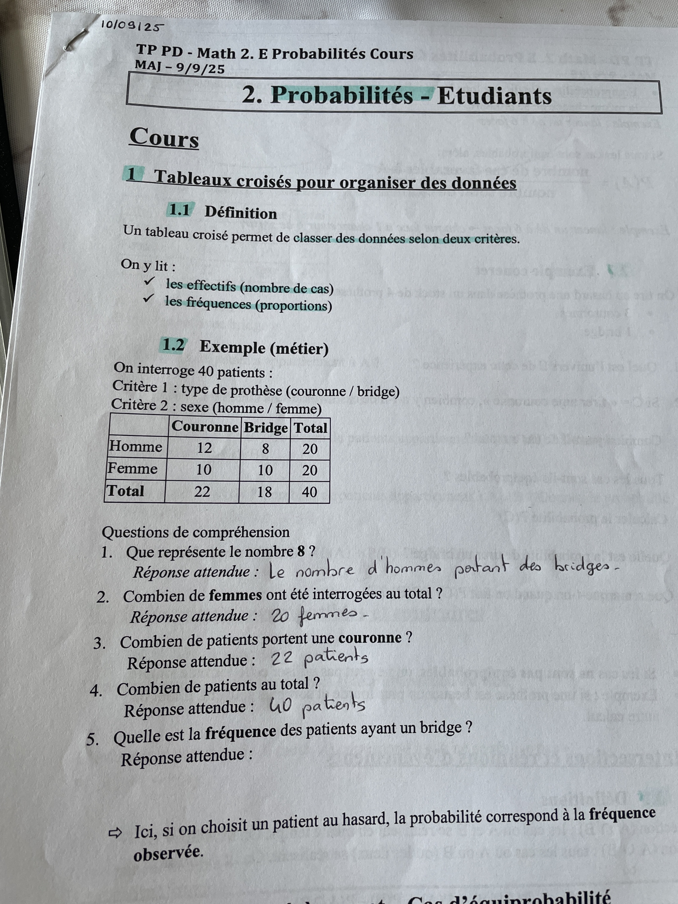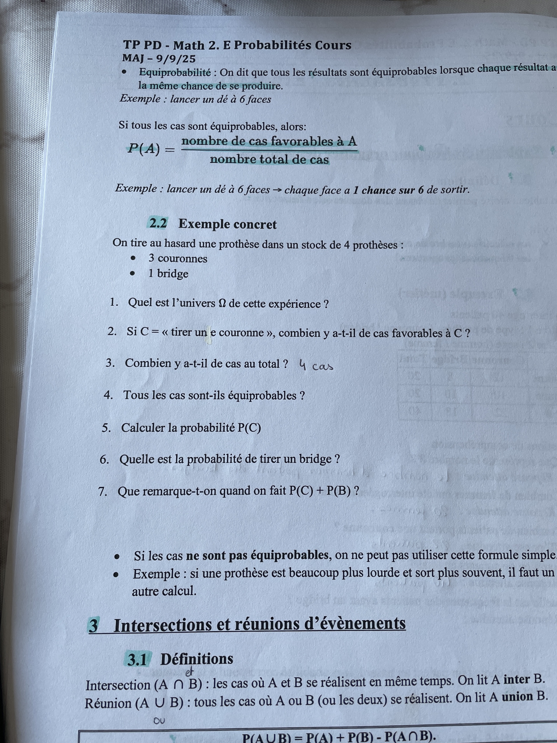 Je suis face à mon exercice de math concernant les probabilités et j’aimerai savoir si vous pourriez vérifier mes réponses et m’aider pour les autres car je ne suis pas sûre ?