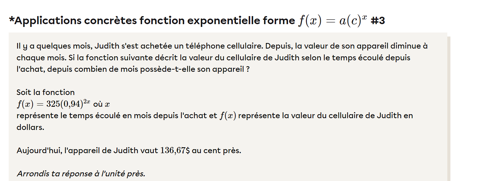 Secondaire 5 • 1asalut dans cette exercice , pourquoi le parametre b est de 2 , si le telephone perd de sa valeur q"une seule fois par mois , (aussi le x est defini par mois) ? merci