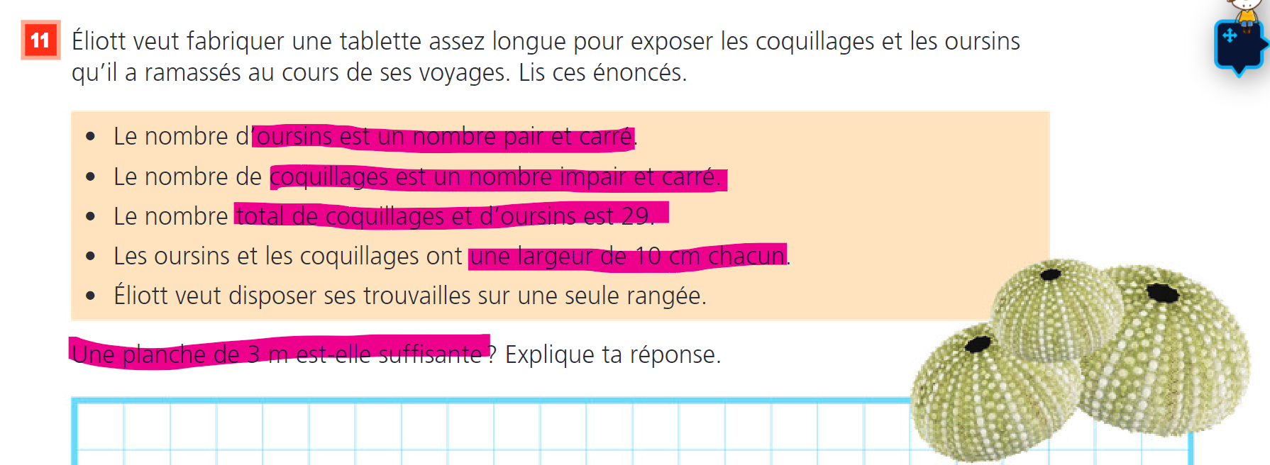 Demain, j'ai un examen sur la divisibilité et l'arbre des facteurs. Je ne comprends pas un numéro, j'ai surligner les donnés important, mais je ne comprendsest-ce que on doit écrire le nombre d'oursins et de coquillages ?De plus, si on doit écrire le nombre d'oursins et de coquillages, alors comment ??Est-ce que vous pouvez m'aider à compléter ce problème ?