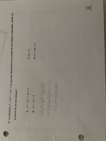 Secondaire 4 • 1aJe ne comprends pas comment décomposer le polynôme. J'ai essayé de le factoriser et ma reponse n'est dans aucun des choix de reponses.