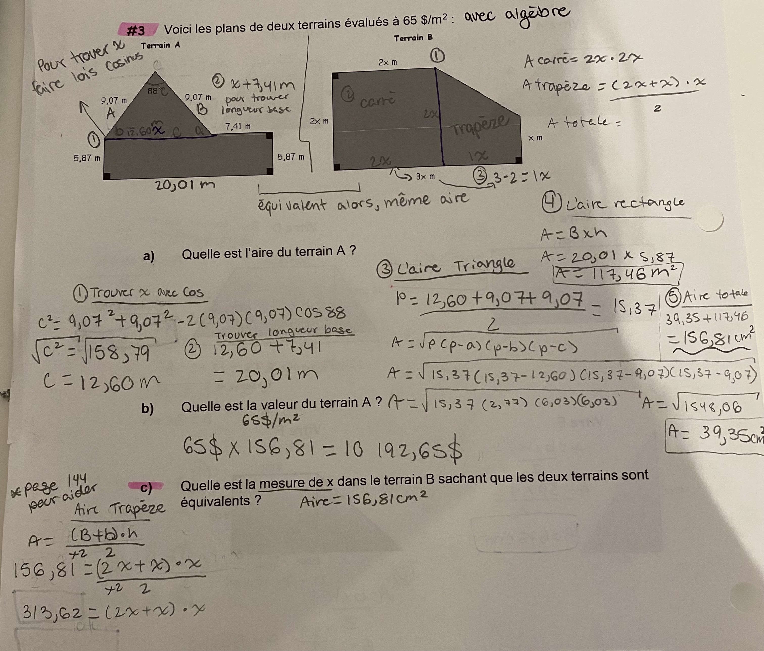 Secondaire 3 • 1aPour cette situation problème, est0-ce que quelqu'un peut me dire si mes démarches sont bonnes? Sinon quelles formules dois-je appliquer? J'ai un test demain matin. Merci!