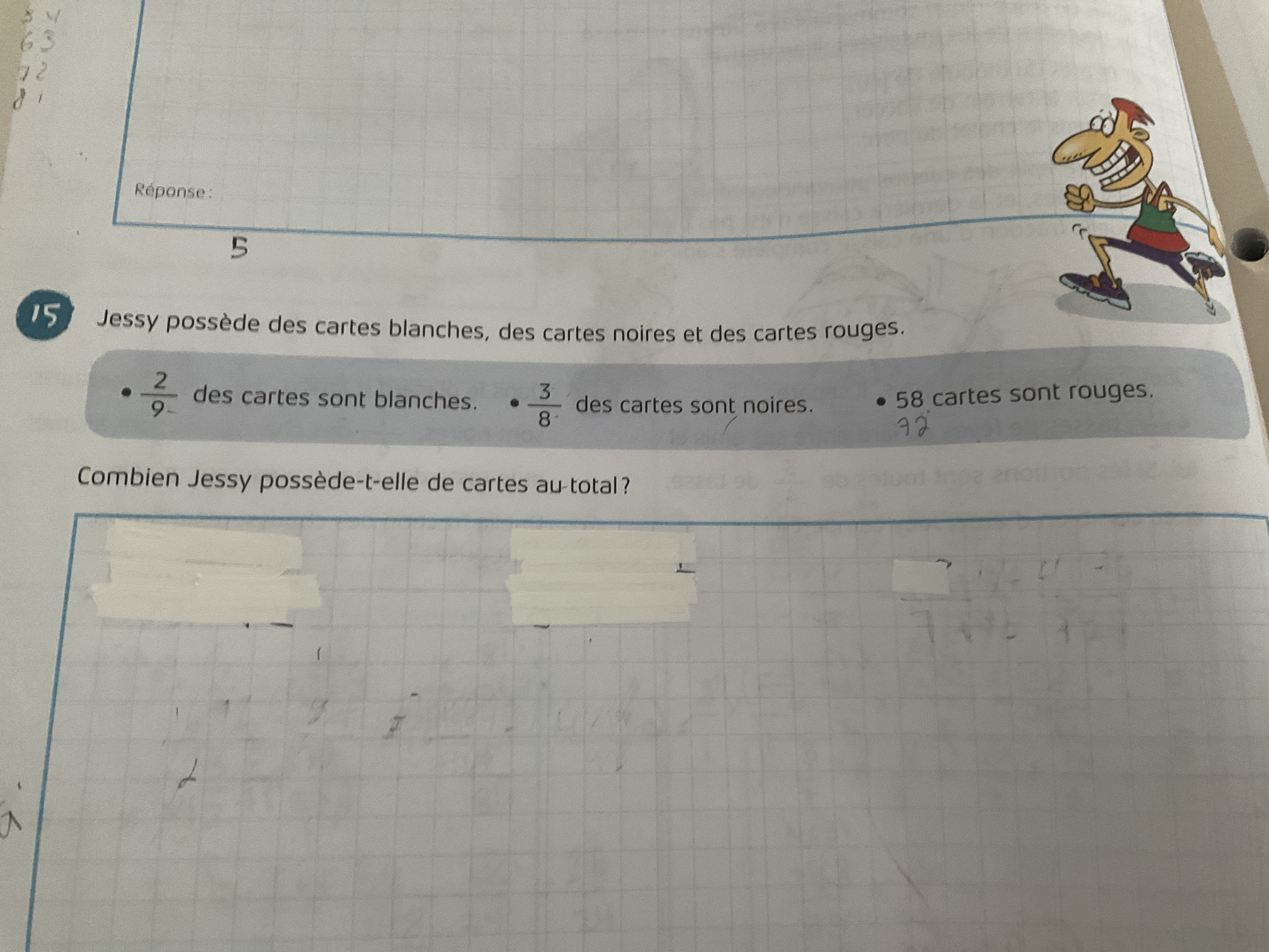 Secondaire 1 • 1aRebonjour, je n'ai toujours pas compris comment on fait pour trouver le nombre totale de cartes. Est-ce qu'il faut tout mettre sur le même dénominateur ? Si oui , comment on fait avec le 58 ?