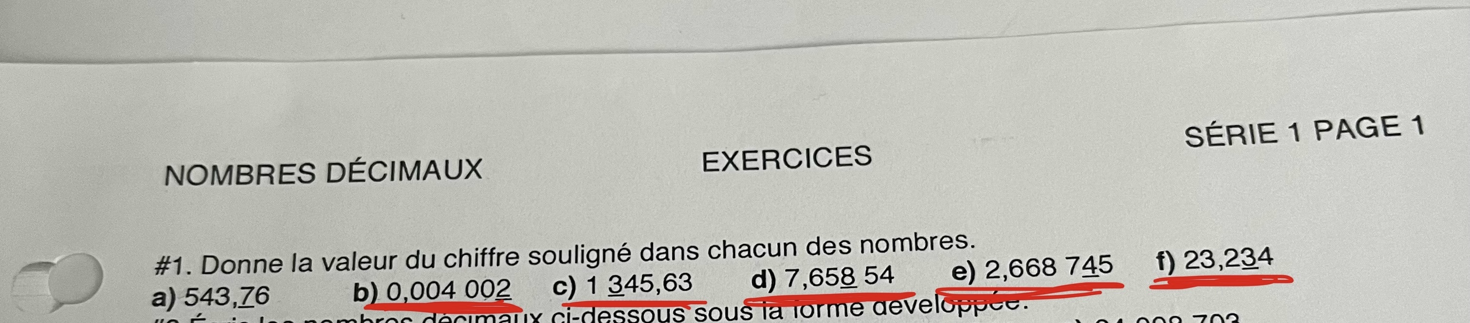 Secondaire 1 • 1aCoucou! Quelqu’un peut m’aider avec cet exercice sur les nombres décimaux? Surtout ceux qui sont souligné en rouge. (Sec 1)
