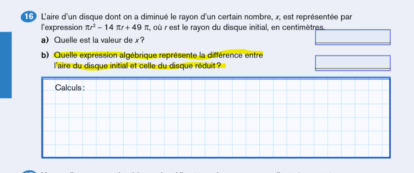 Je ne comprends pas la partie du problème où on me demande d'exprimer algébriquement la différence des aires.