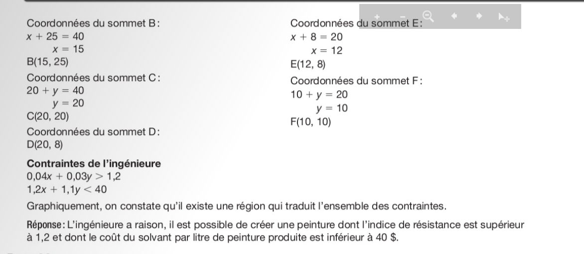 Secondaire 5 • 2aJ obtiens qu il est impossible de concevoir cette peinture parce que aucune des contraintes des ingenieurs est respecer par les points solutions , mais le corrige dit que tout les points sont des solutions , donc les ingenieurs ont raisonapres dans le corrige j ai pas compris pourquoi ils ont trace leur fonctions a optimiser ? sur leur polygone de contraintes? merci
