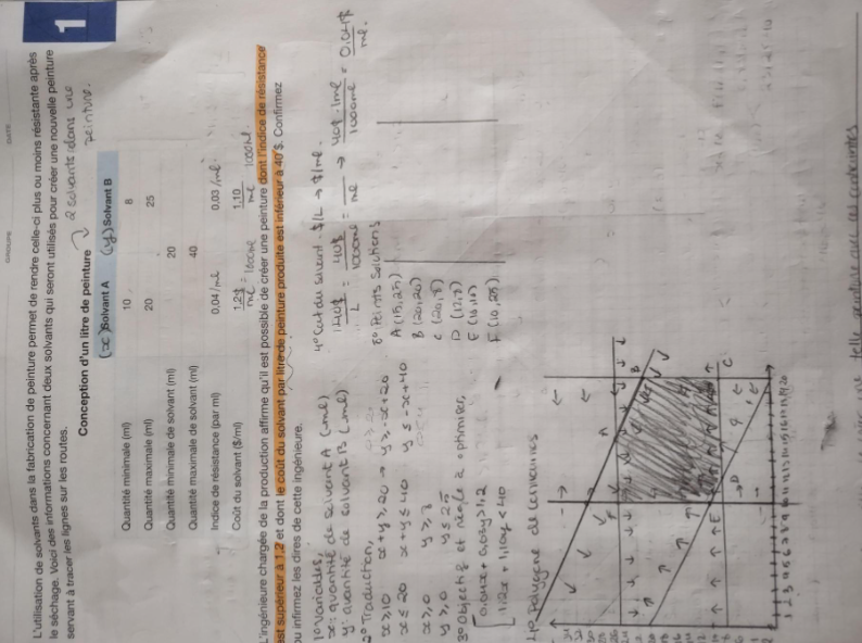 Ici dans ce probleme , je n arrive pas a trouver la fonction Z , (je pense il y en a 2) puis aussi dans les buts des ingenieurs ca dit le cout du solvant pas LITRE de peinture produite est inferieur a 40$ est ce que ca veut dire qu il faut que je convertisse mes cout de solvant par ml en cout de solvant pas litre. Merci