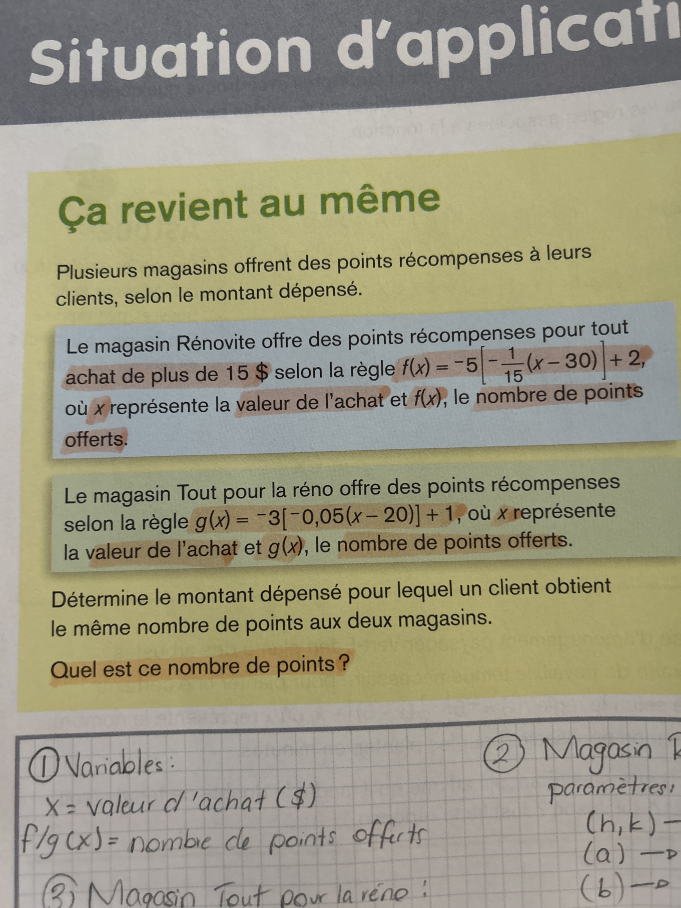 Secondaire 5 • 2aJ’ai encore un problème que je comprends pas. C’est le #8. Donc voici le problème, la réponse, des énoncés (qui pourraient aider), et ce que je pense qu’il faut faire, mais ne c’est juste pas comment: