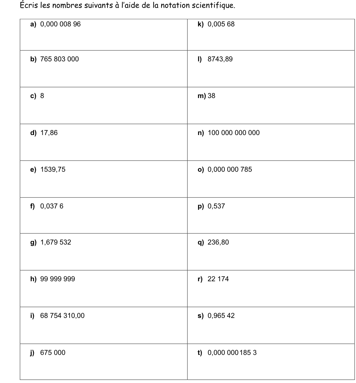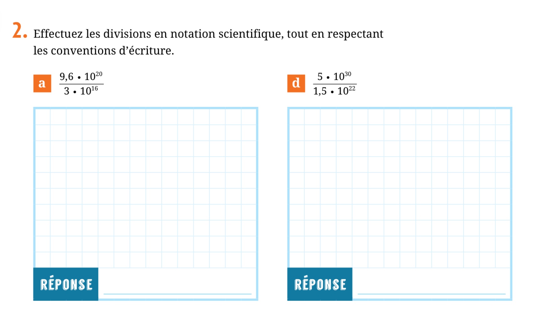 Mes questions sont les suivantes: premièrement, pouvez-vous me dire qu’est-ce qu’il faut faire avec les chiffres qui n’ont pas d’exposant dans cet équation s’il vous plaît c’est la photo où on demande de faire la division en notation scientifique. Deuxièmement, pouvez-vous me donner une technique comment faire pour déplacer la virgule pour déterminer l’exposant à appliquer s’il vous plaît.