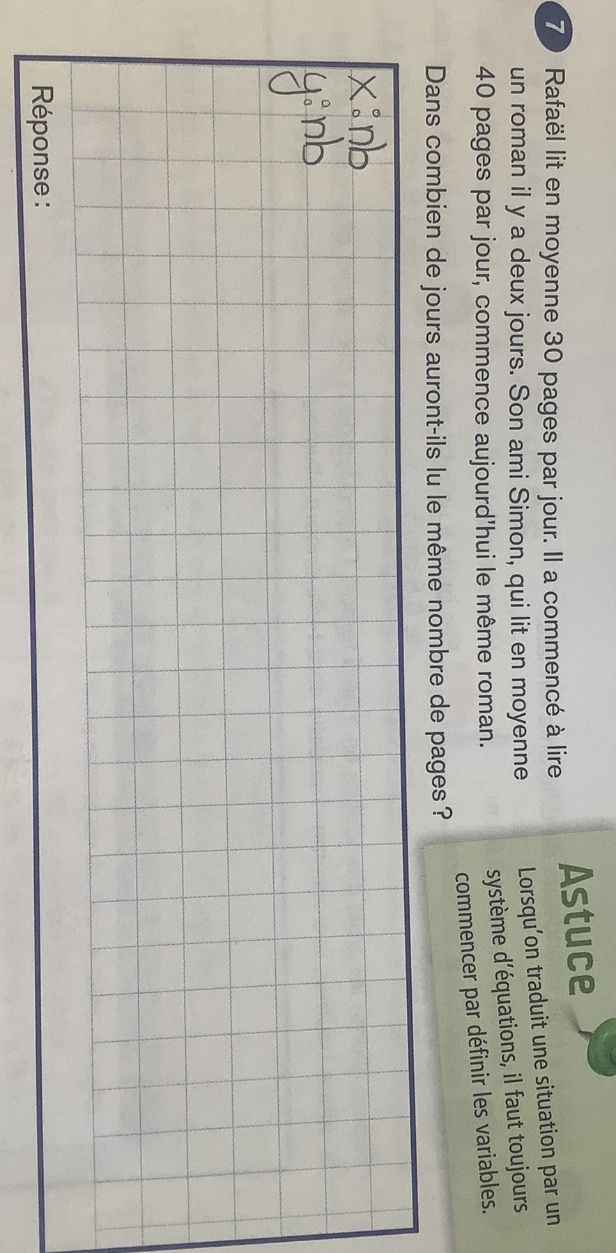 Secondaire 3 • 2aJe ne comprends pas comment résoudre ce problème. Je pense qu’il faudrait trouver les deux règles de chaque équation (pour Simon et pour Rafaël) mais je sais pas trop comment faire . Je ne sais pas non plus quelle est la variable dépendante et la variable dépendante entre le nombre de jour en le nombre de pages. Merci de votre aide