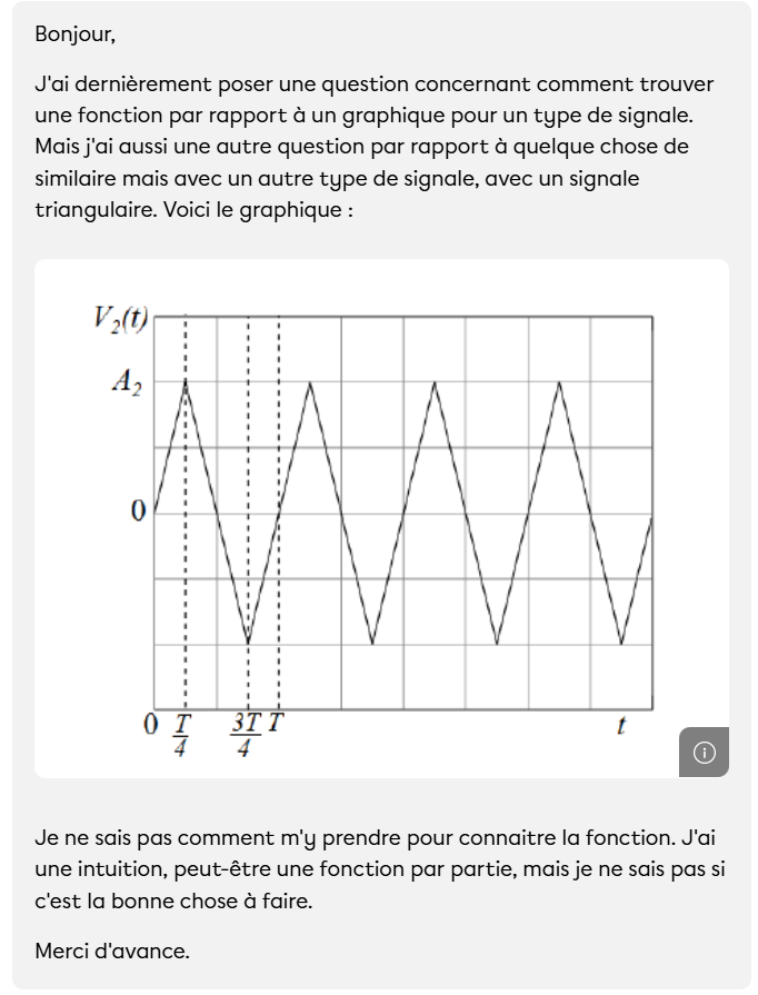 J'ai dernièrement poser une question concernant comment trouver une fonction par rapport à un graphique pour un type de signale. Mais j'ai aussi une autre question par rapport à quelque chose de similaire mais avec un autre type de signale, avec un signale triangulaire. Voici le graphique :Je ne sais pas comment m'y prendre pour connaitre la fonction. J'ai une intuition, peut-être une fonction par partie, mais je ne sais pas si c'est la bonne chose à faire.