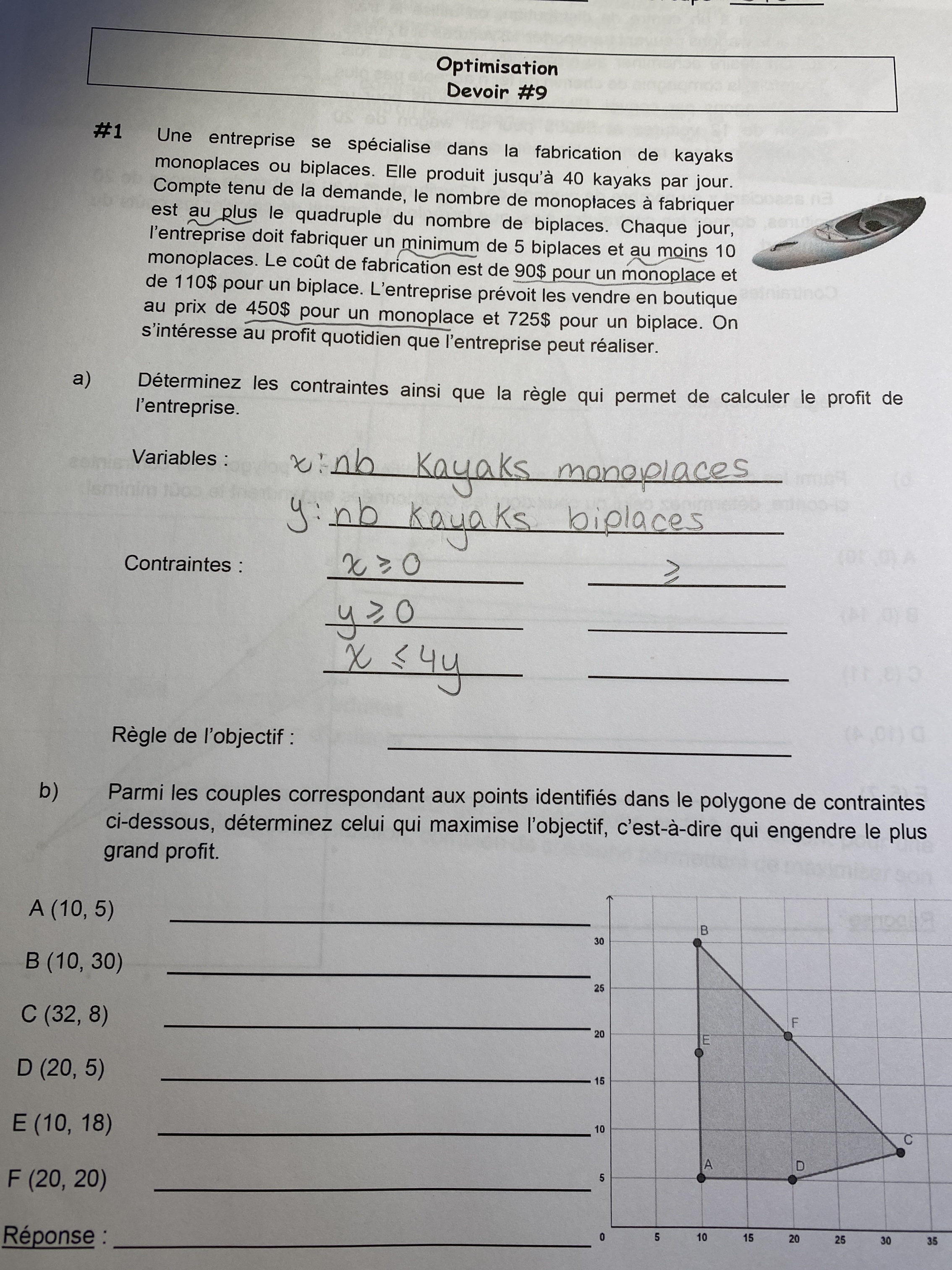 Secondaire 5 • 2aPouvez vous m’aider je ne sais pas comment trouver les autre contrainte je ne comprend pas ?