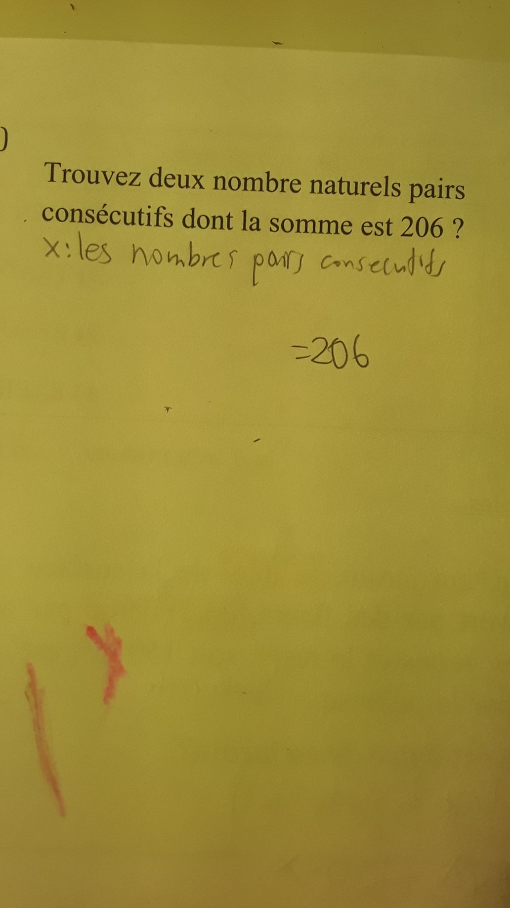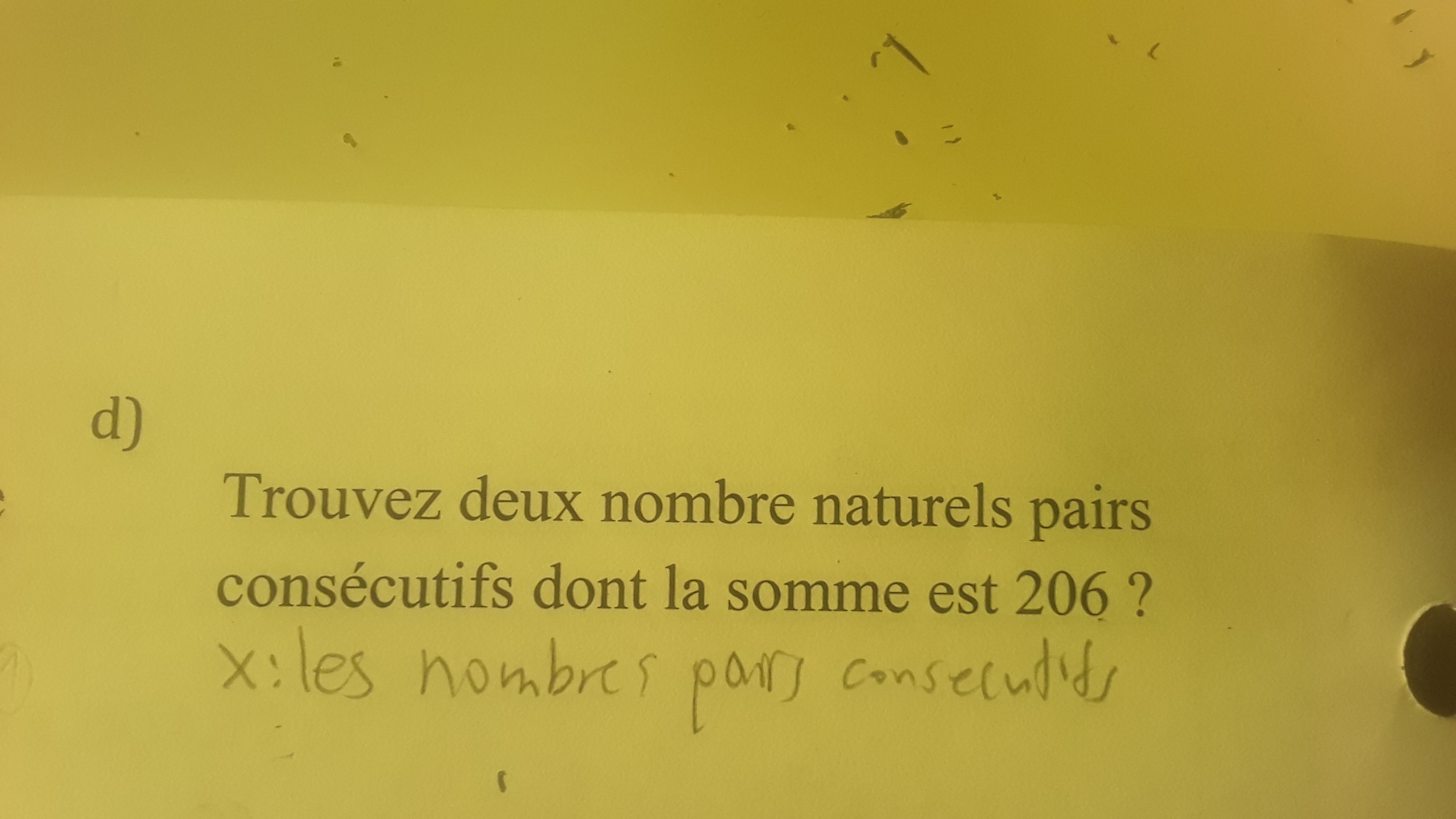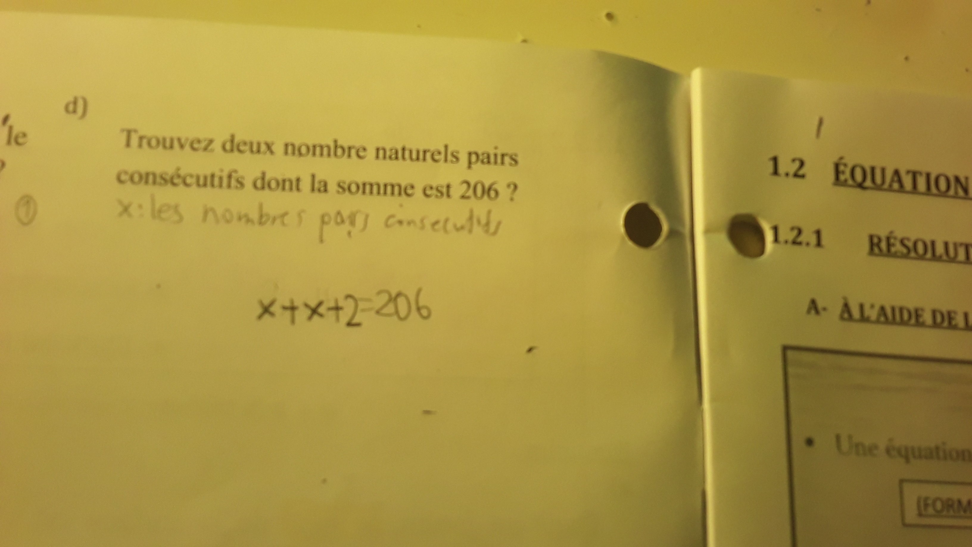 Je veux dire qu'il n'y a pas assez d'éléments pour trouver l'équation dans ce problème. Qu'est ce qui me fait penser ça c'est que ça dit trouvez deux nombres naturels pairs consécutifs ok et je dois le trouver. Donc ça donne un élément dont la somme est 206 dont ça nous fait penser =206, ça donne seulement un premier élément donc maintenant vous me comprenez pourquoi que dans ce problème il n'y a pas assez d'éléments pour trouver l'équation.