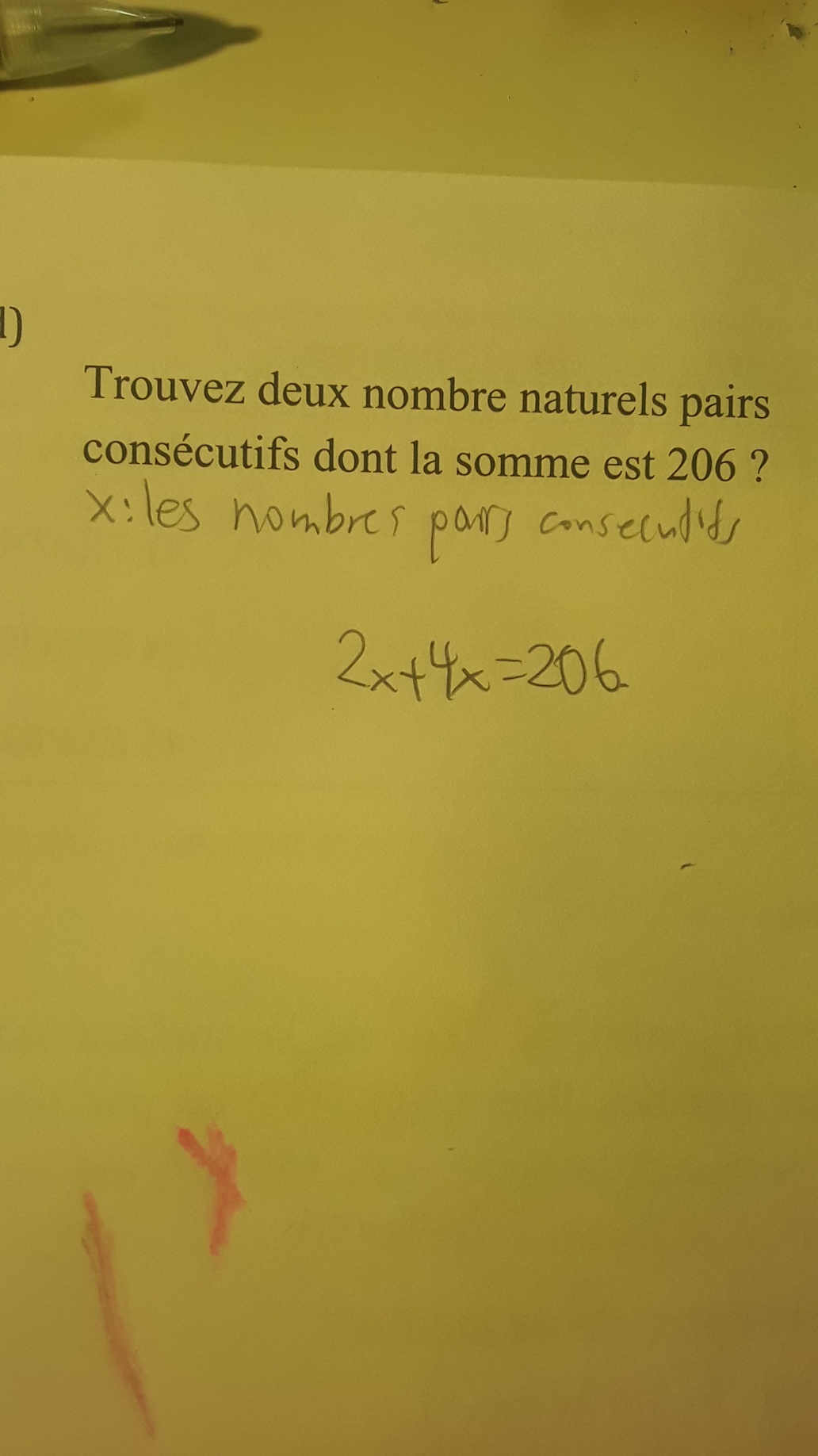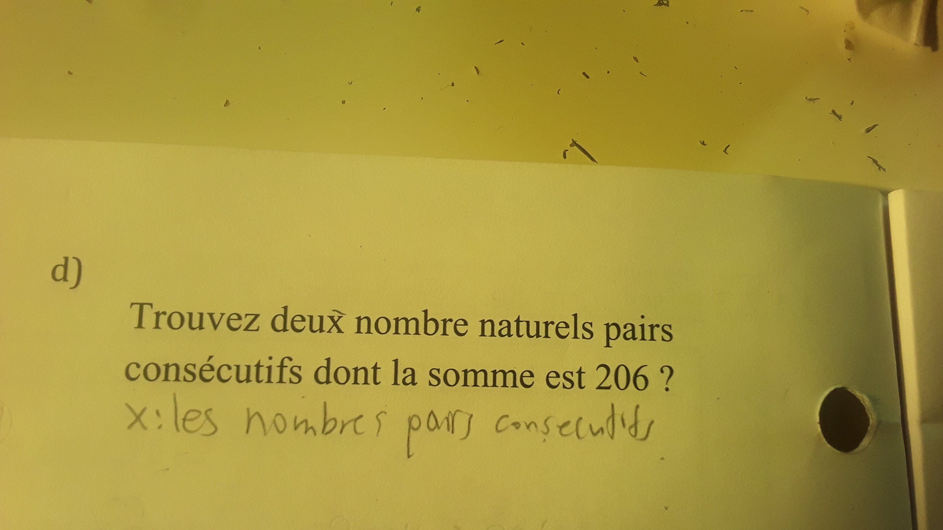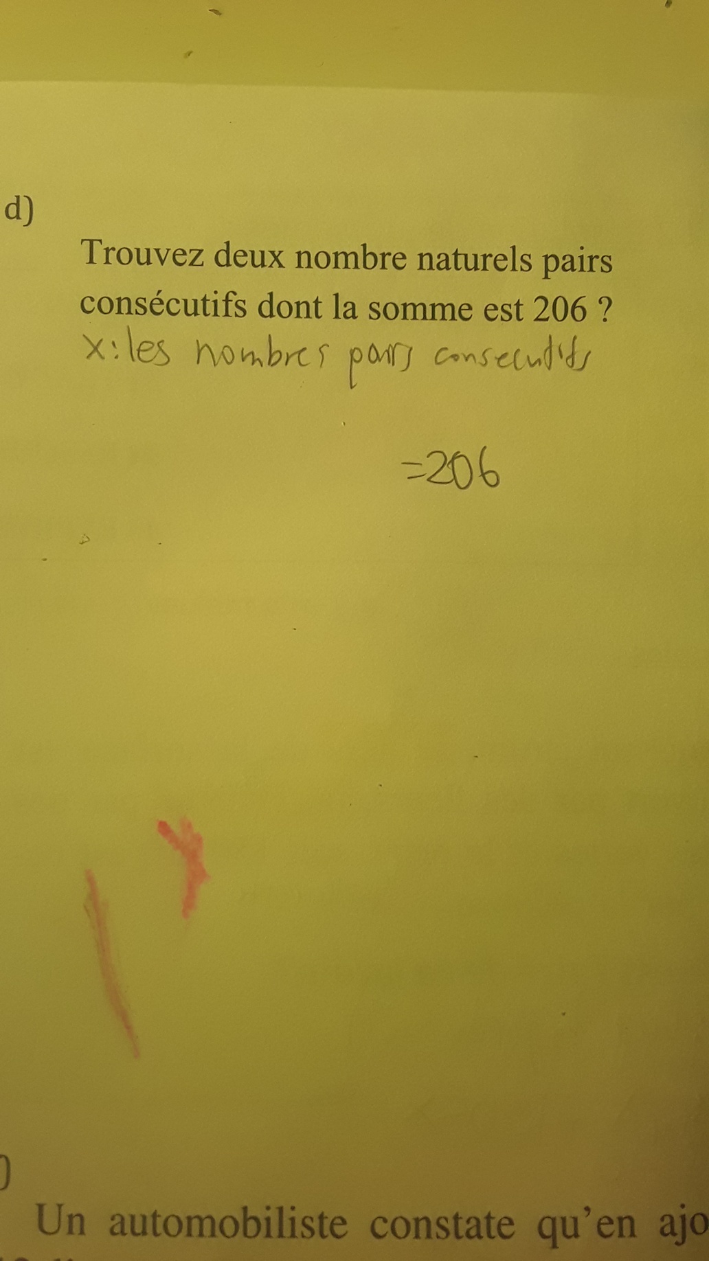 Je veux dire qu'il n'y a pas assez d'éléments pour trouver l'équation dans ce problème. Qu'est ce qui me fait penser ça c'est que ça dit trouvez deux nombres naturels pairs consécutifs ok et je dois le trouver. Donc ça donne un élément dont la somme est 206 dont ça nous fait penser =206, ça donne seulement un premier élément donc maintenant vous me comprenez pourquoi que dans ce problème il n'y a pas assez d'éléments pour trouver l'équation.