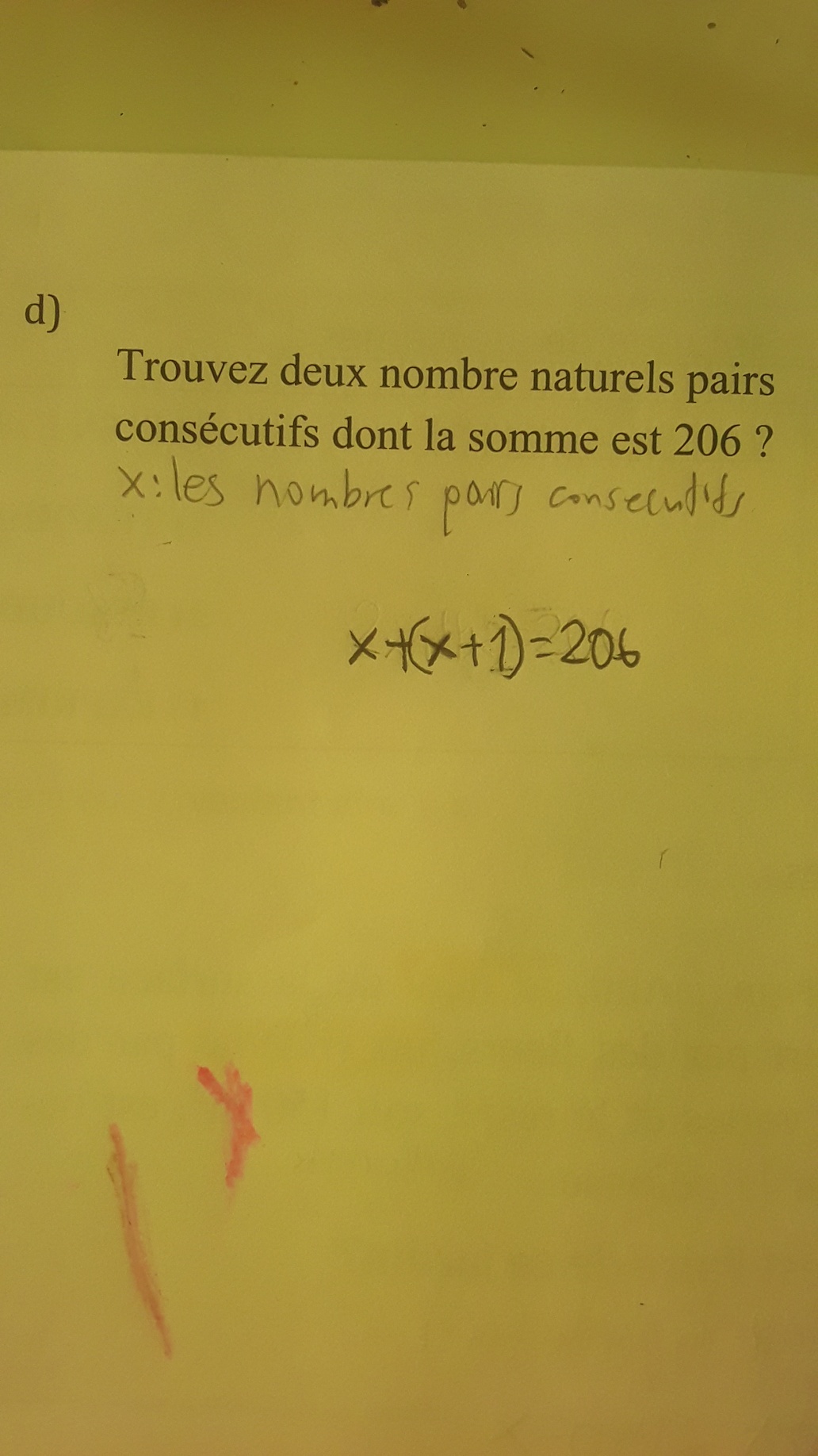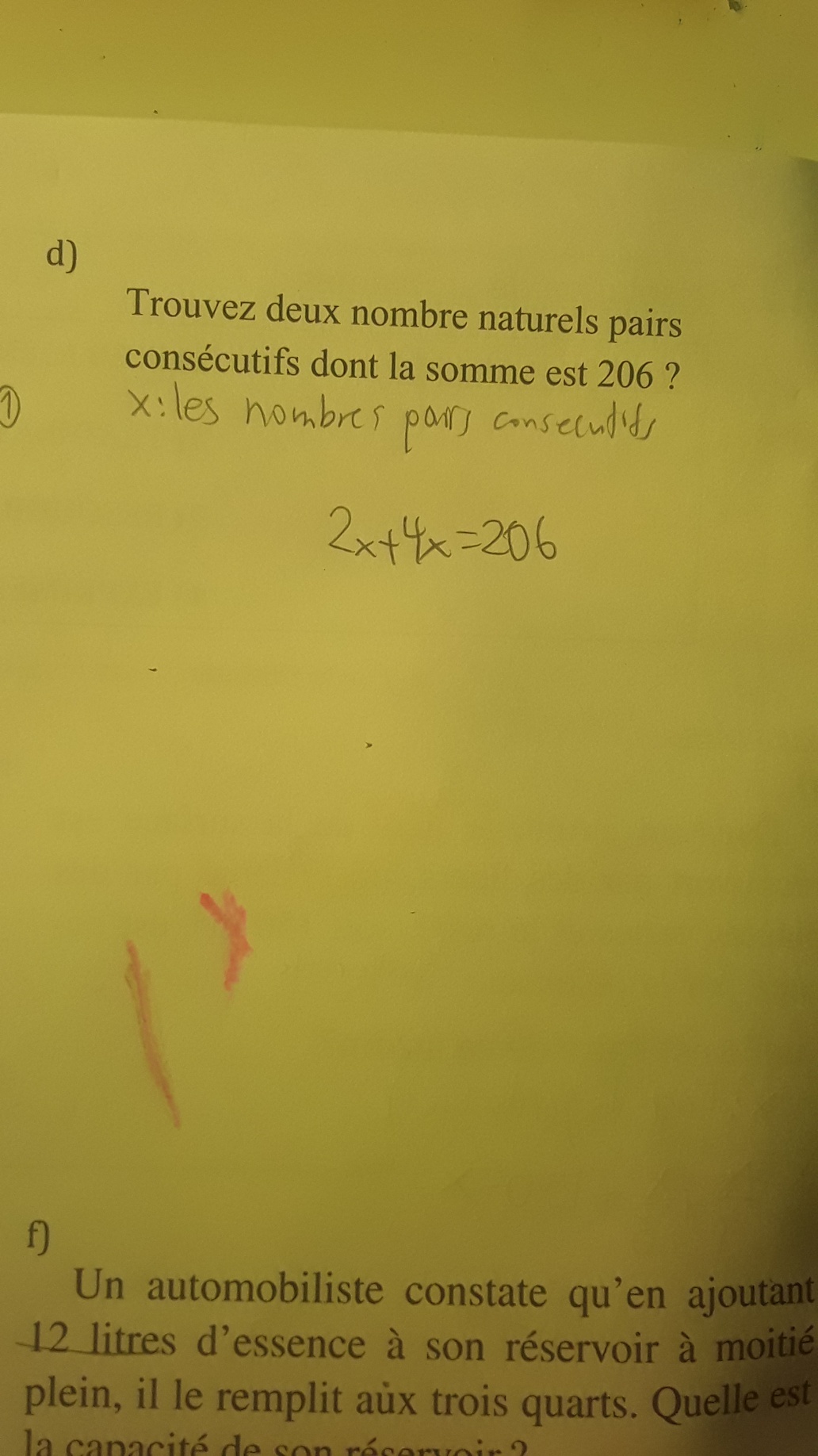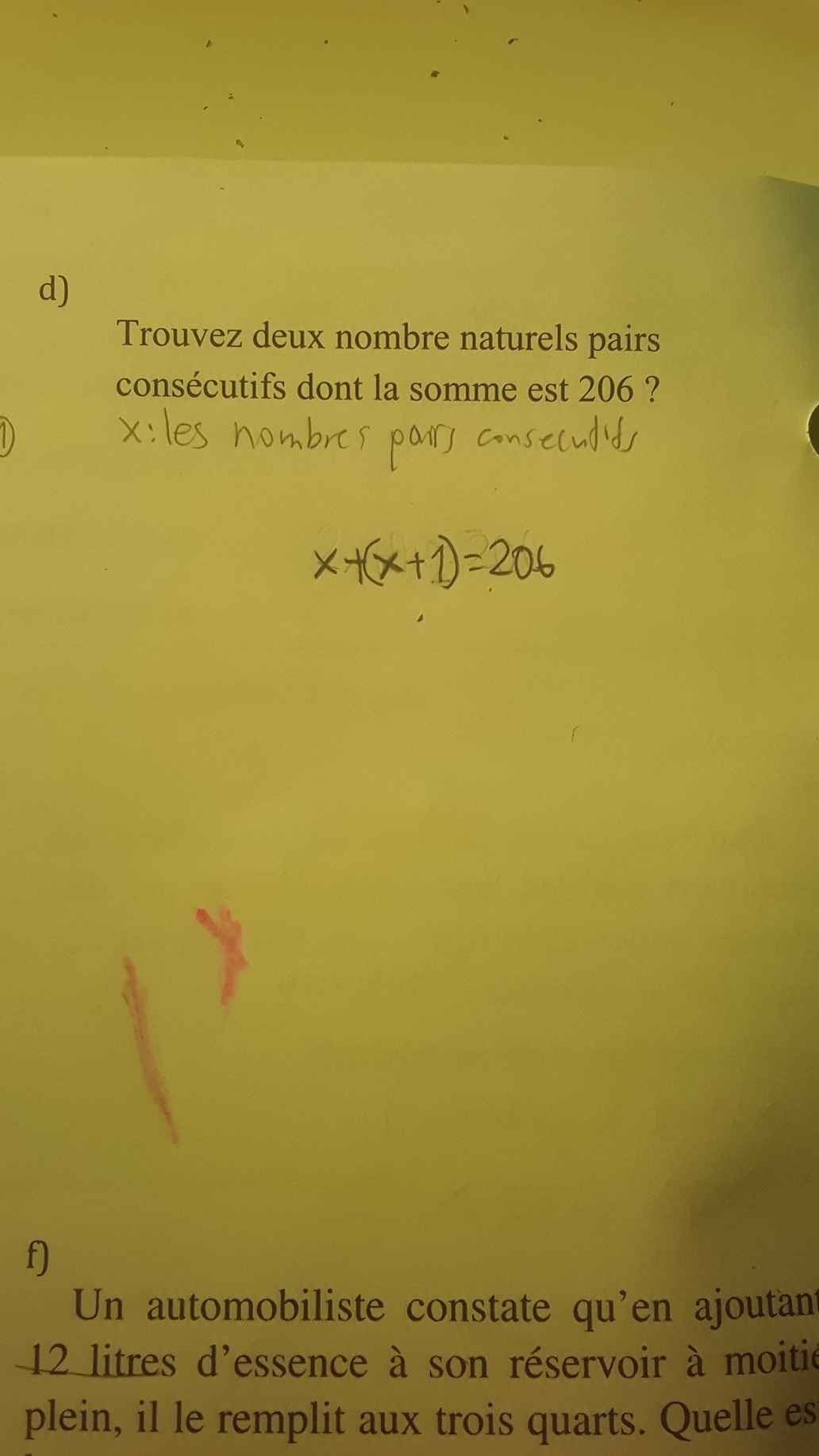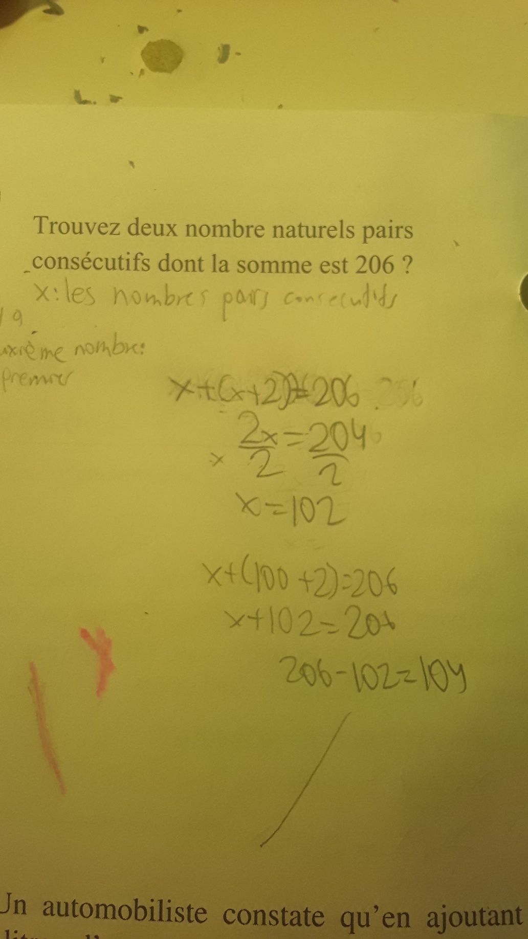 1)Pouvez-vous me dire comment on a pu savoir que c'était ça x+(x+2). Le problème est que dans ce problème on donne seulement l'information que la somme est 206 ok mais vous dites qu'il y a de l'information sur le deuxième nombre: il est consécutifs au premier. Cette information que vous avez dit n'était pas dans ce résolution de problème.