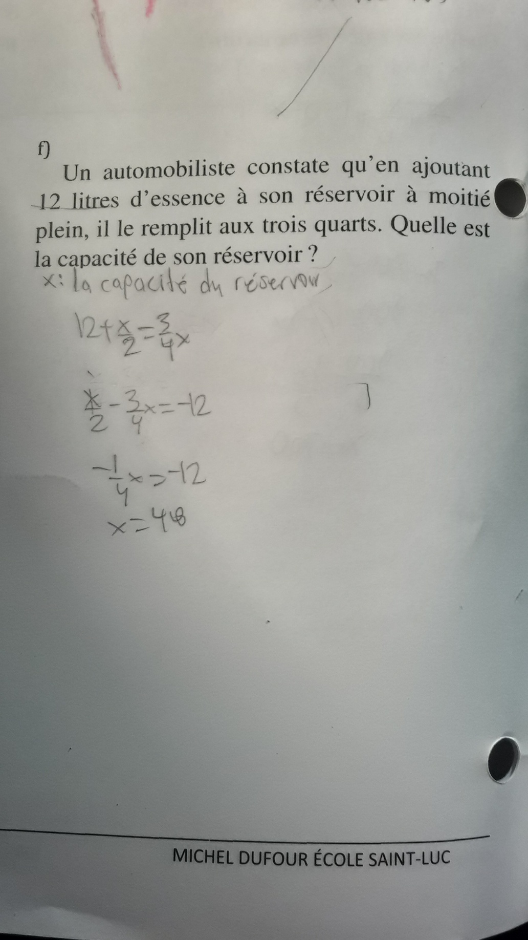 Pourquoi le 3/4 c'est le total, je suis confus 😕 de voir que le 3/4 c'est le total parce que ça me fait penser que le 3/4 c'est la capacité de son réservoir alors je ne vois pas comment. Cela doit être l'équation: 12+x/2+3/4x=x.