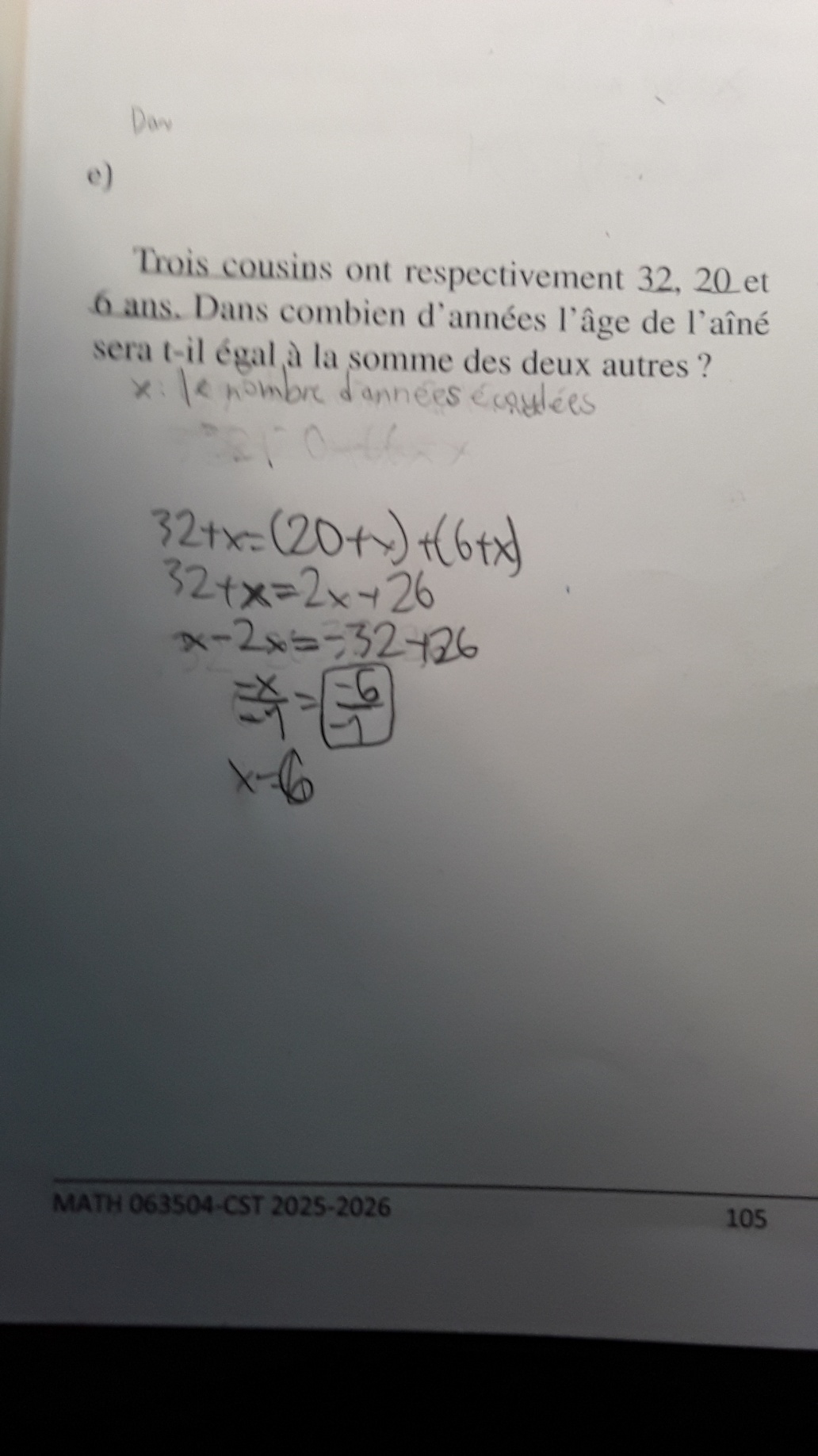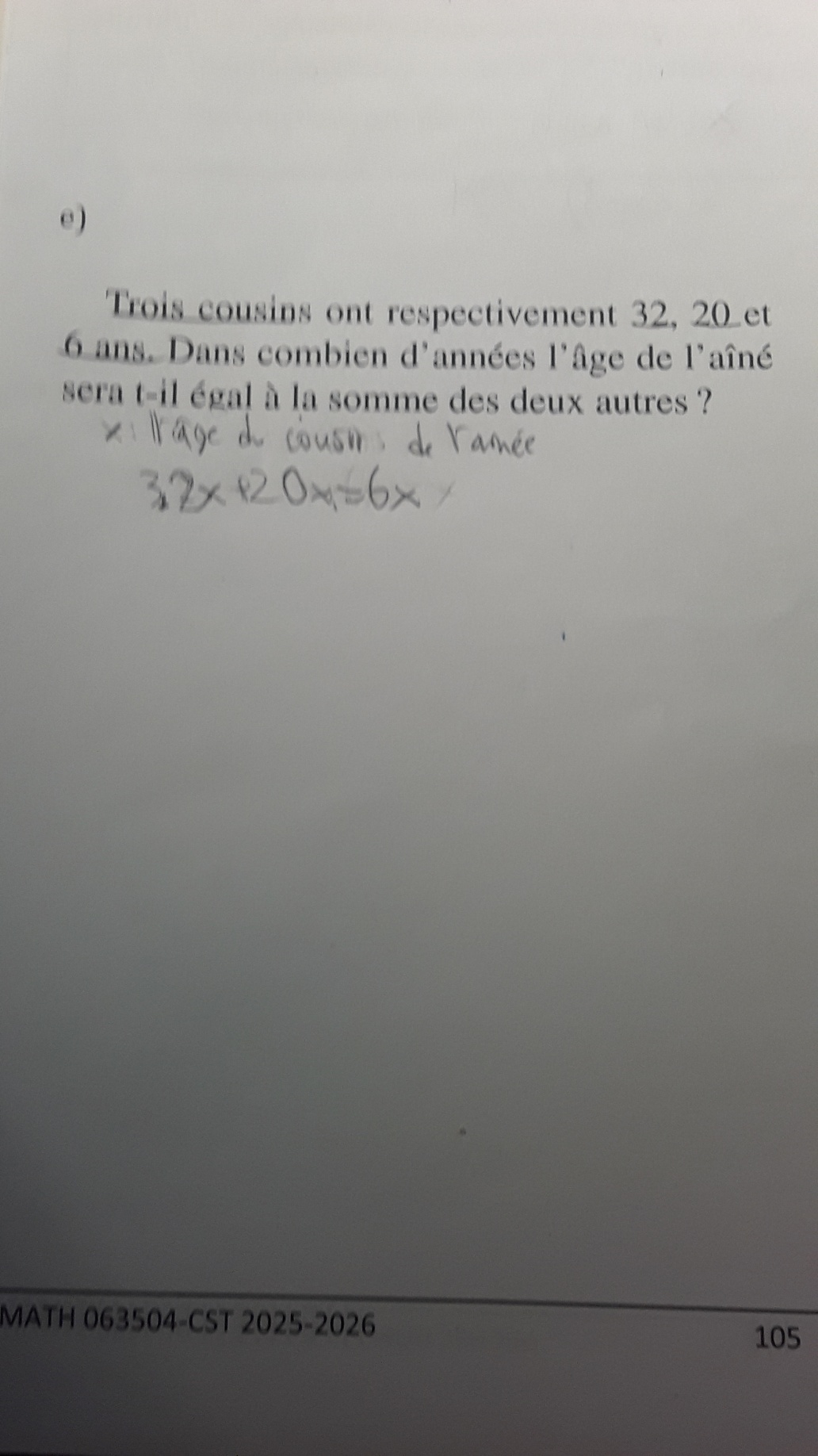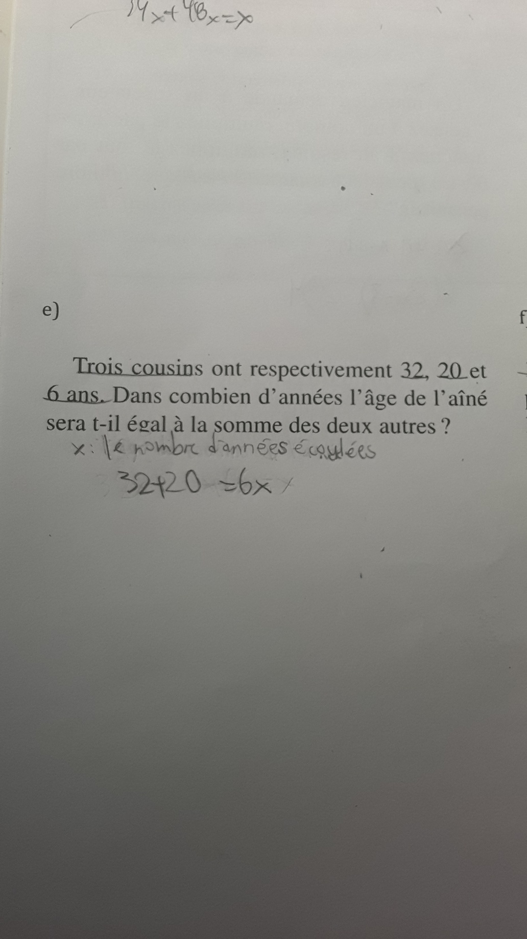 1)Je vais m'expliquer pourquoi je n'arrivais pas à trouver la bonne équation. Je n'arrivais à trouver la bonne équation parce que dans ce problème, ce n'était pas clair. Pourquoi? Parce que dans ce problème, on disait l'aîné ok mais on ne disait pas qui est l'ainee ça m'a fait penser que l'aîné était parmi les trois cousins donc voilà pourquoi j'ai mis un x au 6 ce qui m'a donné comme équation 32+20=6x mais finalement vous avez changé mon équation. En disant que l'équation c'est 32+x=(20+x)+(6+x). Jai été confu de voir que le 6 n'était pas 6x mais était 6+x mais je ne comprenais pas parce que quand vous avez ajouté 6+x c'est comme ça m'a fait penser que le cousin de 6 ans n'est pas l'ainee donc j'ai commencé à avoir un doute sur le nombre cousin parce que ce n'est pas logique qu'il y a6+x et non 6x alors que je ne suis posé la question il y a combien de cousin. Est ce que c'est quatre ou trois parce que si vous mettez 6+x c'est là que j'ai un doute donc ca me fait penser qu'il ya quatre cousin et non trois alors que le problème dit qu'il y a trois cousins et non quatre cousin comme je le pense. Ce problème est vraiment du grand n'importe quoi. Dans ce probleme on ne disait pas qui était l'aîné donc c'est normal que j'ai mis 6x donc ce n'est pas de ma faute.