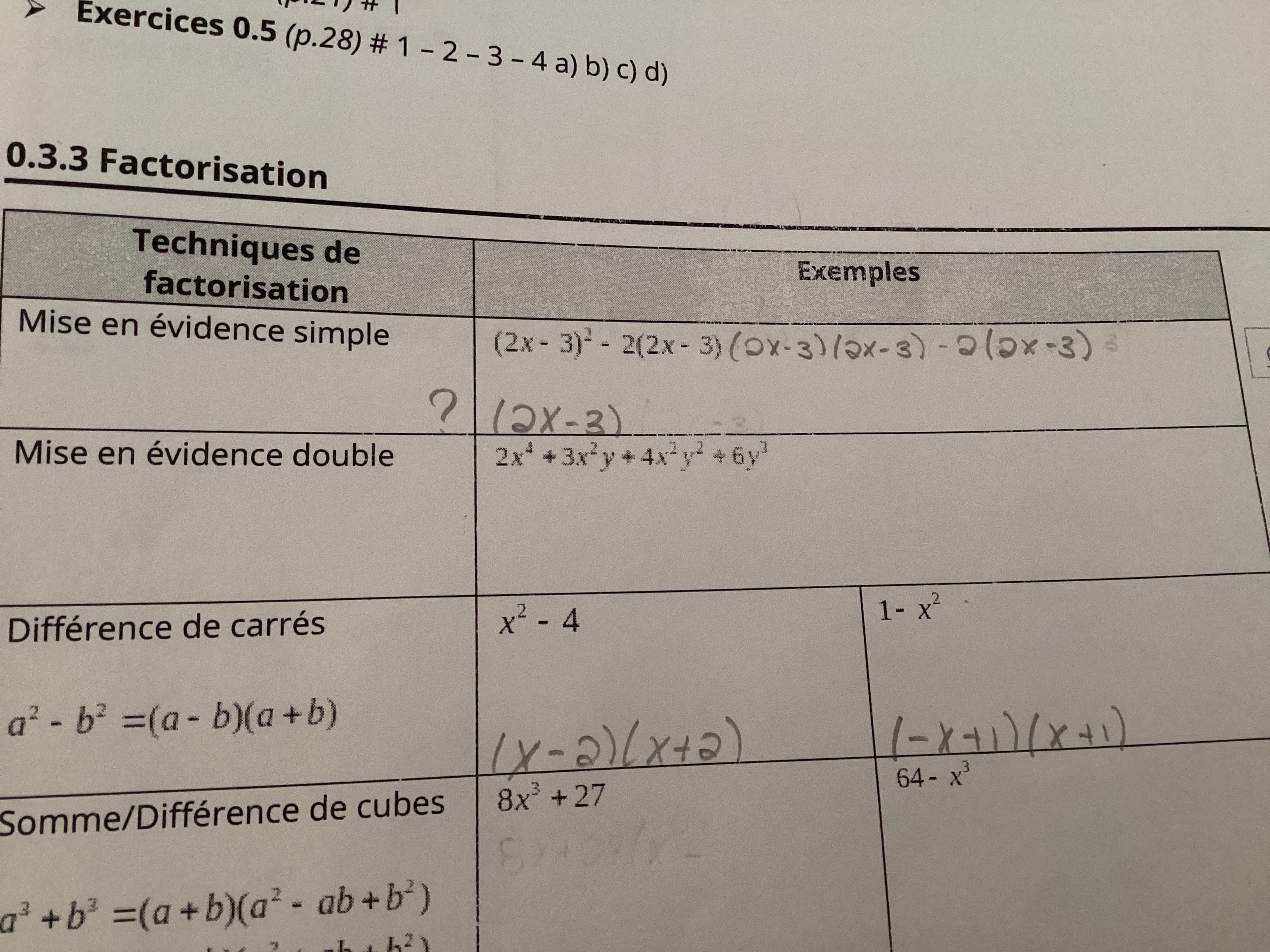 Secondaire 5 • 3mAllo, je crois que j’ai été trop longtemps en vacances, j’arrive pas a me rappeler comment faire une mise en évidence simple et double pour ces deux exemples. Merci de votre aide :)