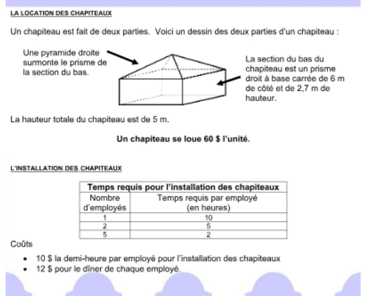 Ici, pour savoir combien ça va me côuter pour la location, je sais que je dois savoir j'ai combien de chapiteaux en tout. Sachant que c'est un bal de finissants pour 168 élèves de 5ème secondaire mais que j'ai 1192 élèves au total. Là je ne sais pas quel calcul faire. Est-ce que c'est 168 chapiteaux ou 1192 chapiteaux (parce que c'est par personne). J'ai alors décider de calculer le volume d'un chapiteau ça m'a donné : 124,8 m³ (je ne sais pas si c'est bon)Pour l'installation des chapiteaux maintenant, je ne sais vraiment pas ce que je dois faire. (Le dépliant est juste au dessus.)Aidez-moi svp, je vous serais grandement reconnaissante.