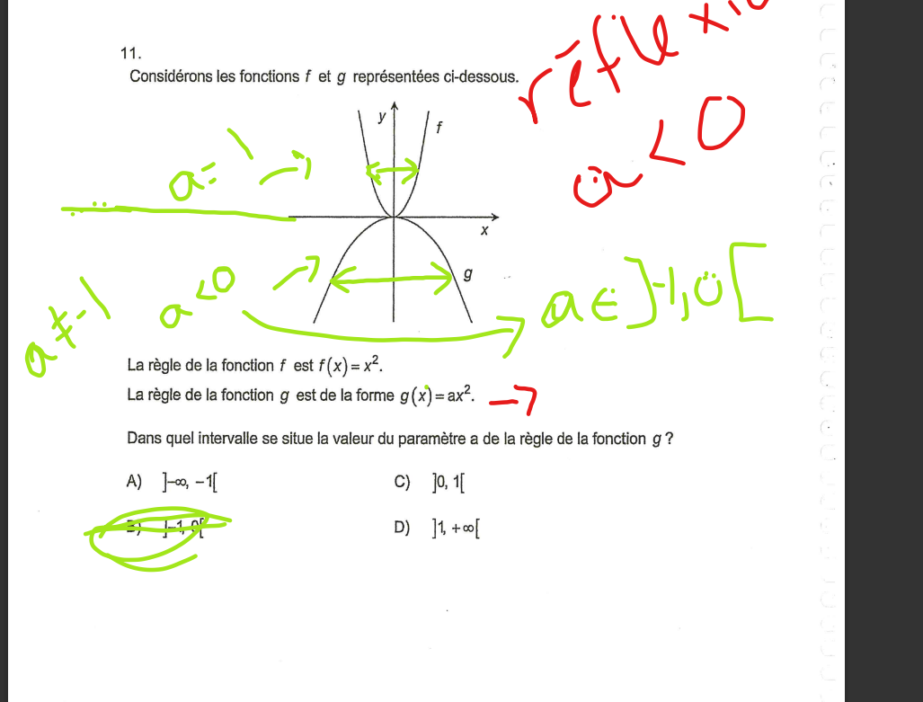 Secondaire 4 • 2asalut ici est ce que le parametre a est bien situe dans cette ensemble solution puis pour justifier on peut dire que il y a eu une relfexion par rapport a l axe des x alors alors le a est negatif puis que la largeur de la parabole est plus fgrande que celle de la fontion de base donc automatiquement cela veut dire que le parametre a dans ce cas est situe entre o et -1 exclus ... ?merci