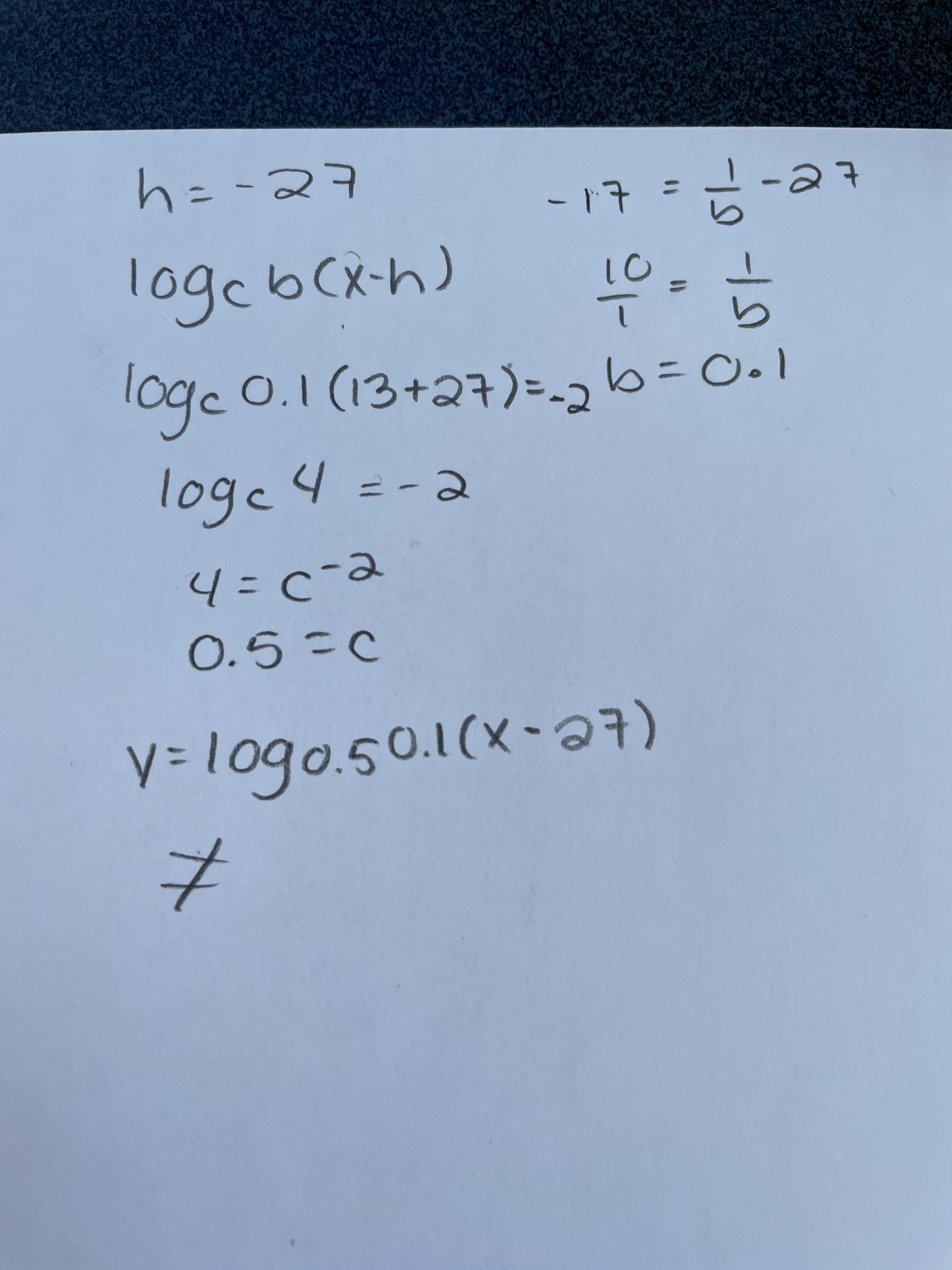 Secondaire 5 • 2aBonjour c’est encore moi concernant la fonction logarithme. J’arrive encore à b=0,10 et c=0.5 mais la réponse est b=0,1 a=-1
