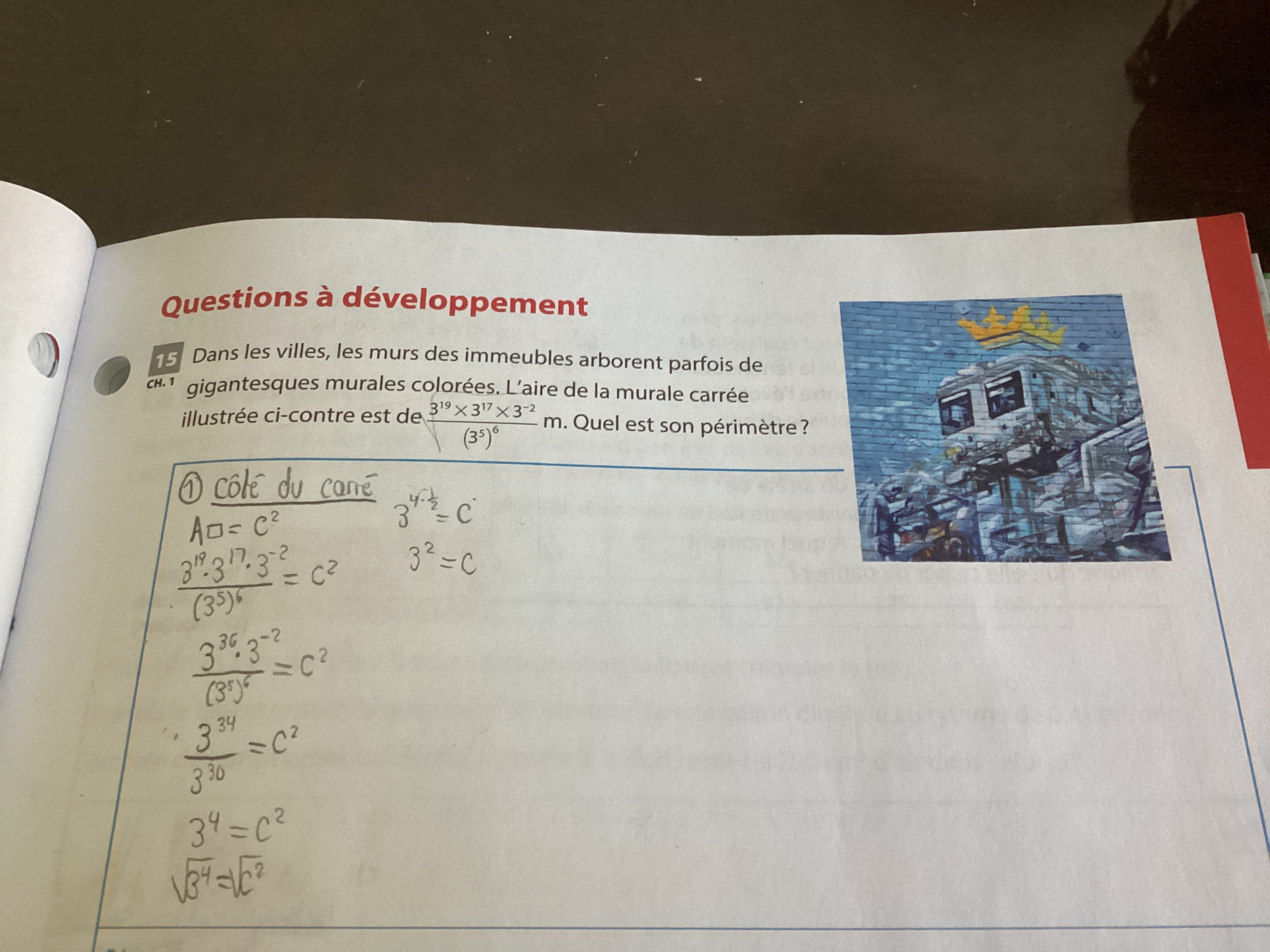 Secondaire 3 • 2aBonjour, je fais une révision de toute l’année et un problème de révision. Est-ce que dans ce problème, je dois résoudre l’exposant (le 3^2) pour trouver le côté du carré? Merci