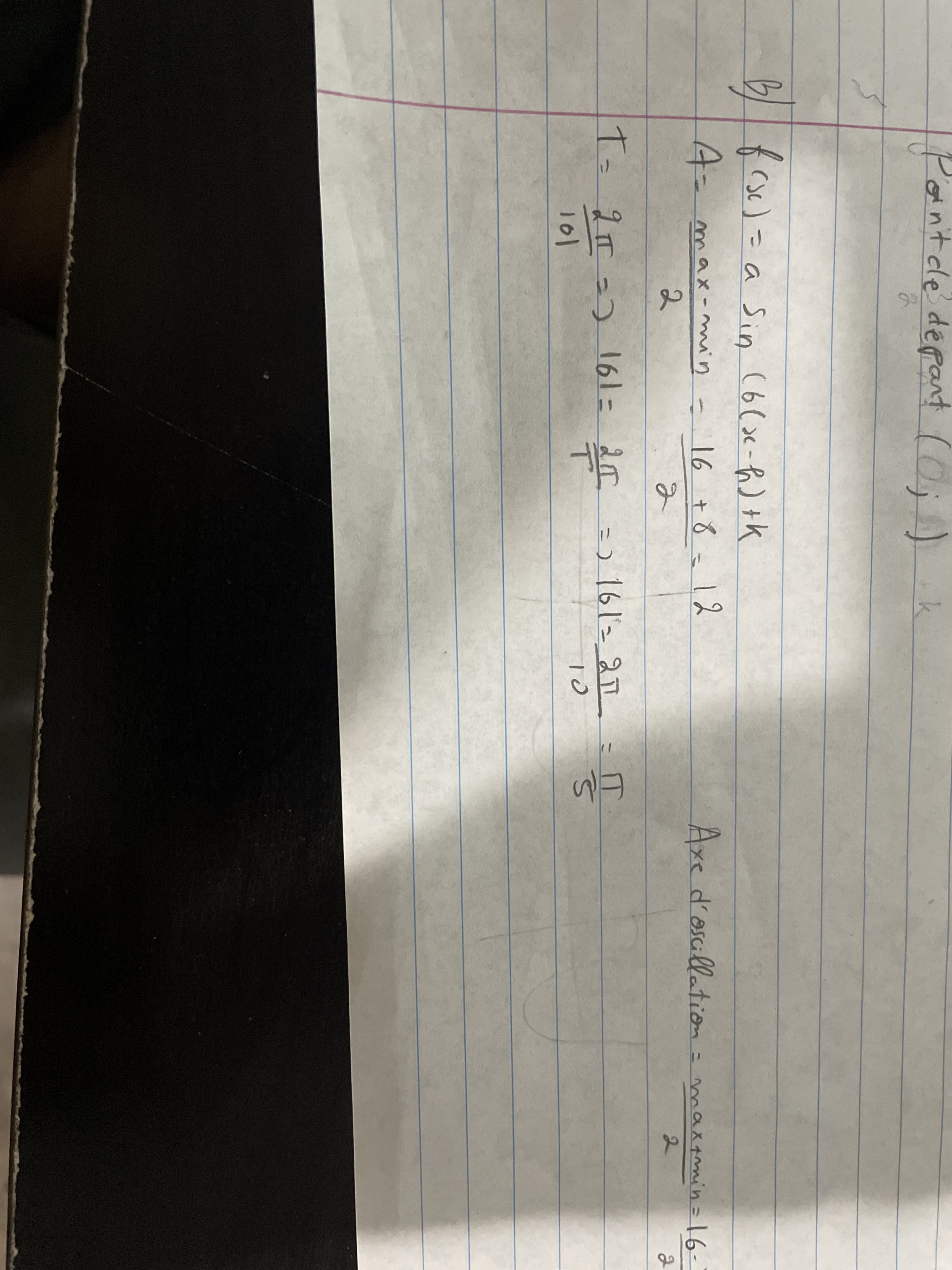 Secondaire 5 • 2aBonjour, dans cet exercice, il faut trouver la règle de la fonction. Voici ce que j’ai réussi à faire, mais il me manque les points (h;k). J’ai tracé, mon axe d’oscillation, mais je n’arrive pas à trouver avec certitude le point «h ». Aussi, selon le corrigé, a et b sont positifs. Comment est ce possible? La courbe décroît.