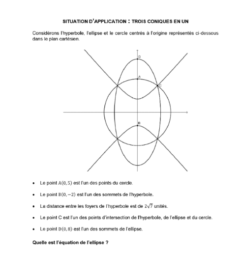 Secondaire 5 • 2aJ'ai commencé cette situation problème, mais je ne sais pas comment la continuer. J'ai trouvé le "b" dans l'équation de l'hyperbole, mais je ne sais plus quoi faire par la suite... Pourrais-t'on m'éclairer ?