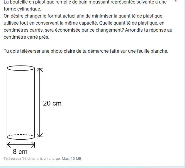 Secondaire 5 • 11jj'aprend l'optimisation des solide et je me suis dit que bon celui qui a la plus petite aire cest la boule aire j'ai trouver volume cylindre apres trouver rayon de la boule avec le volume du cylindre et je l'ai remplacer dans la formule de l'aire de la boule et ça ma donner 108,62