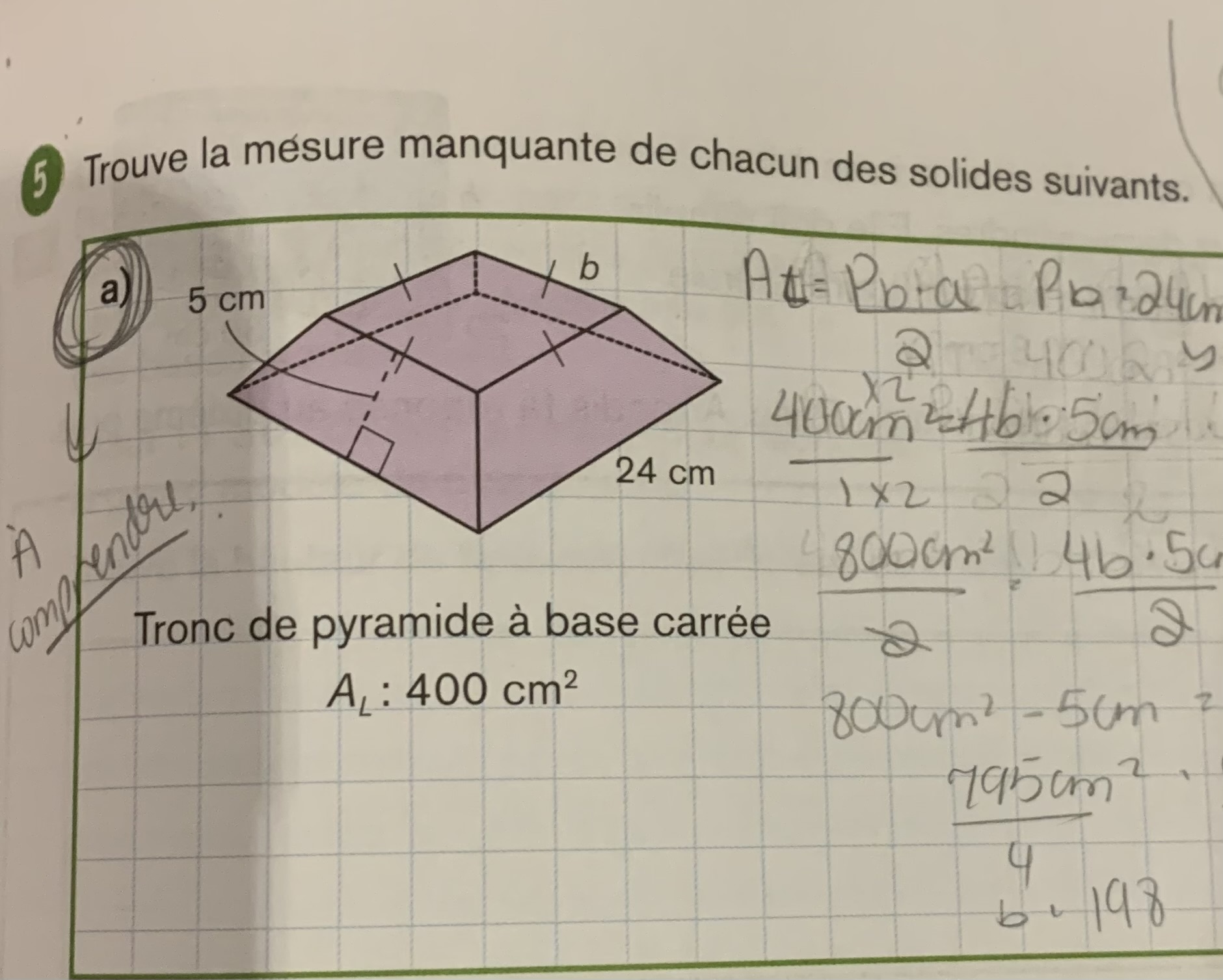 Secondaire 2 • 2aBonsoir, je suis en deuxième secondaire et je ne comprends pas comment retrouver la mesure manquante à partir de l’aire latéral et l’aire totale. Si vous plaît pourrez-vous m’aider.Merci d’avance Alloprof.