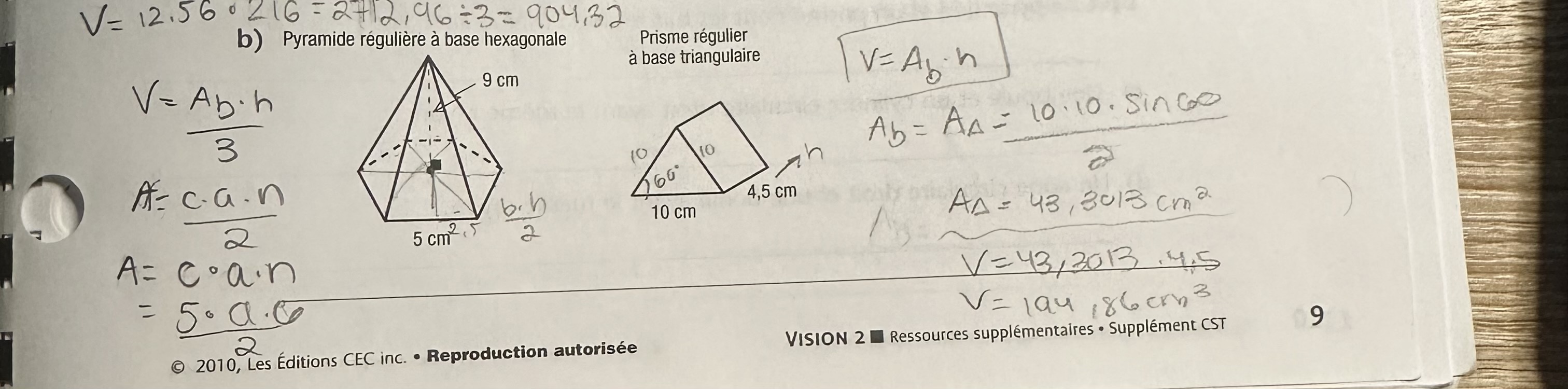 Secondaire 5 • 2aBonjour, j’ai besoin d’aide pour ce numéro. Pour la première figure je dois trouver le volume. Mais avant de trouver le volume je dois trouvé l’aire de la base. Mais pour trouver l’air le de la base et appliquer la formule c•a•n divise par 2 j’ai besoin de lapoteme. Je ne sais pas comment trouver cette mesure manquante. Jai besoin de votre aide. Merci, voici le numéro :