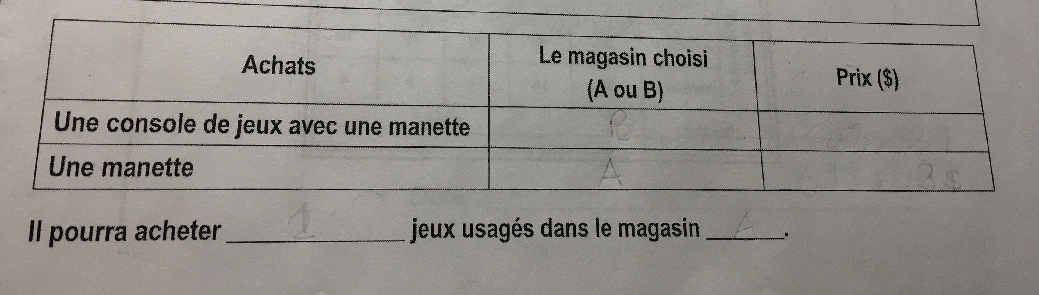 Quelqu'un m'avait repondue a cette question mais j'ai pas compris cette phrase :Antoine veut acheter la console et les manettes les moins chères. Il faut donc choisir quel magasin est le mieux. Pour se faire, additionne le prix de deux manettes et d'une console pour chaque magasin. Tu pourras choisir le moins cher.Ensuite, tu sais qu'il a 750$ d'économiser, on veut donc trouver combien il lui reste d'argent pour s'acheter des jeux. Pour se faire, tu dois soustraire 750$ et le montant.Ensuite, tu pourras choisir le nombre de jeux selon le montant qu'il reste et le coût des jeux.Pouvez-vous m'aider une autre fais ca serais facile pour moi ?